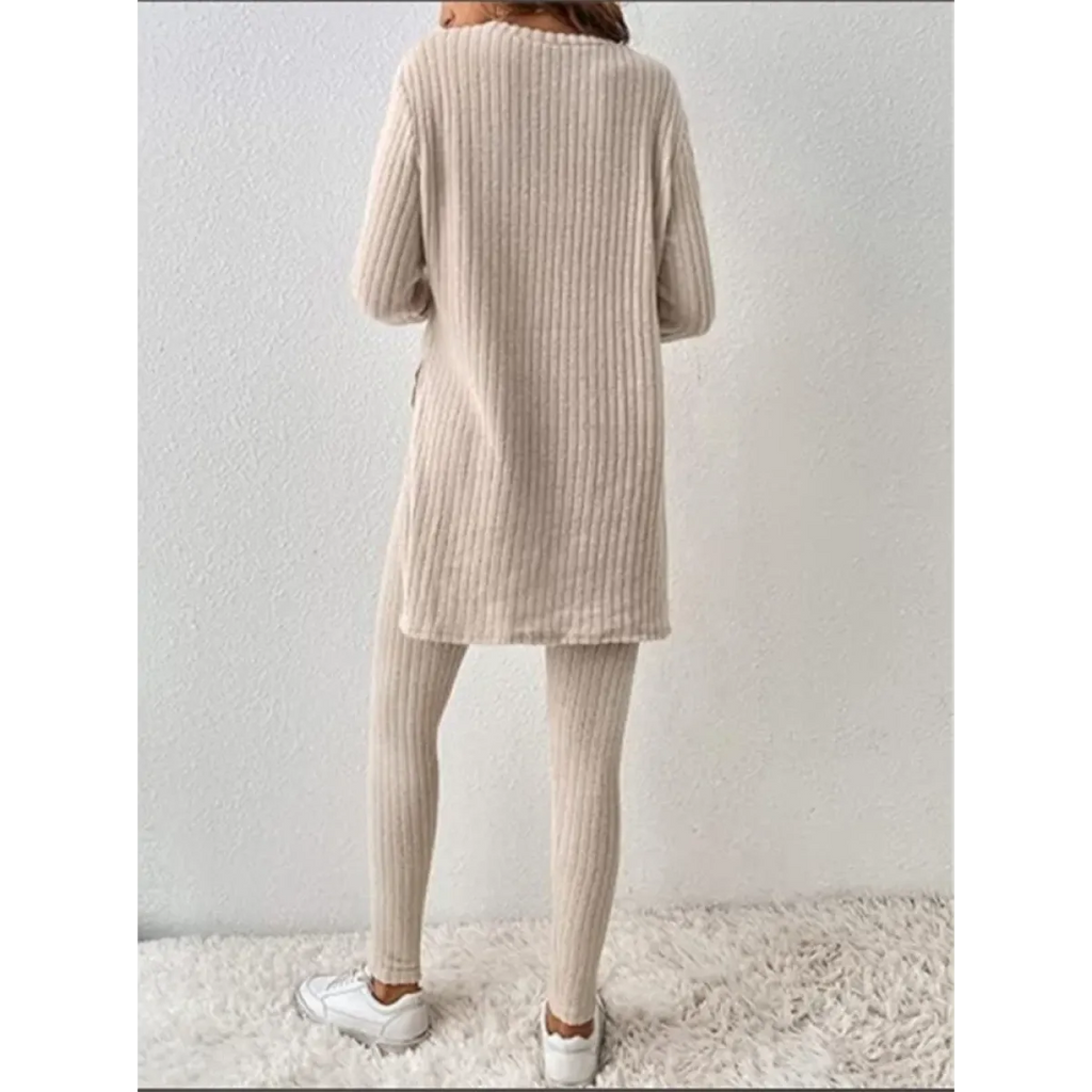 Beige Ribbed Knit Two-Piece Set – Split Long Sleeve Top & Pants
