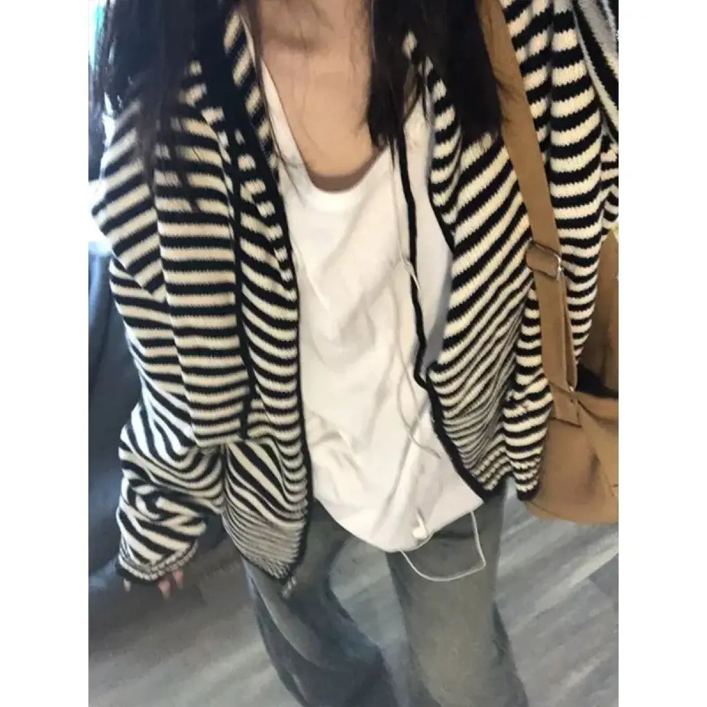 Cozy up in style with this vintage-inspired Harajuku knit cardigan! Featuring bold black and white stripes, a comfortable hood, and a convenient zip-up design, this cardigan is perfect for layering and adding a touch of sporty chic to your autumn and winter wardrobe.