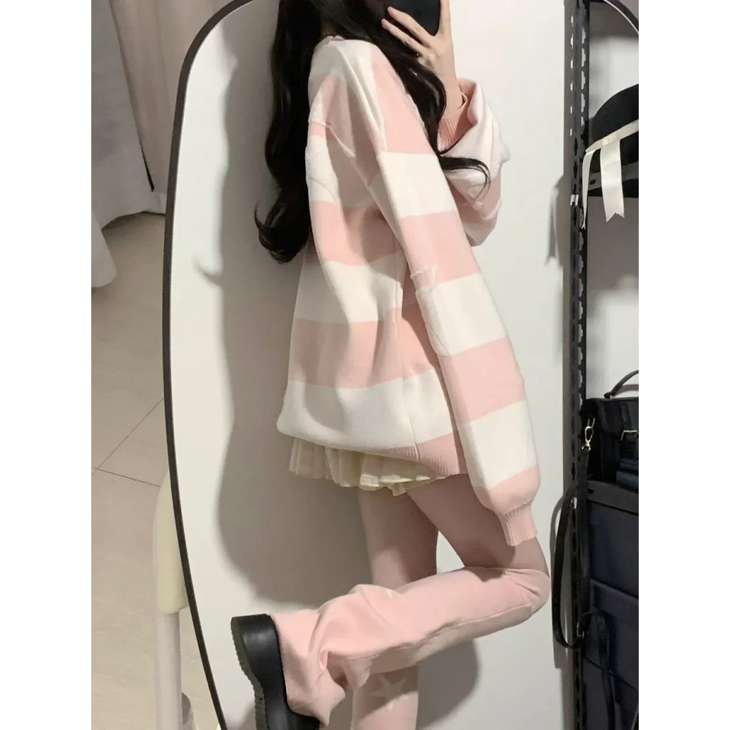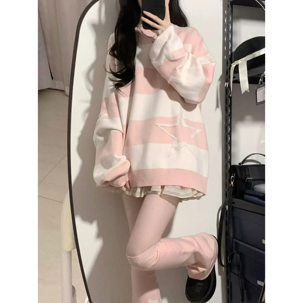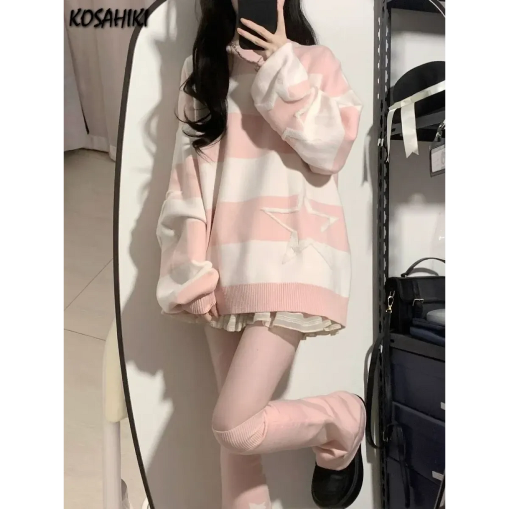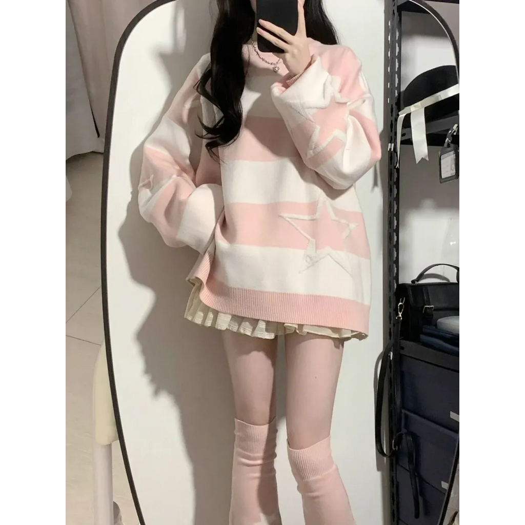 Cosmic Grunge Starry Sweater is a cozy oversized pullover featuring pastel pink stripes and a stitched star patch, perfect for soft grunge and kawaii streetwear looks.