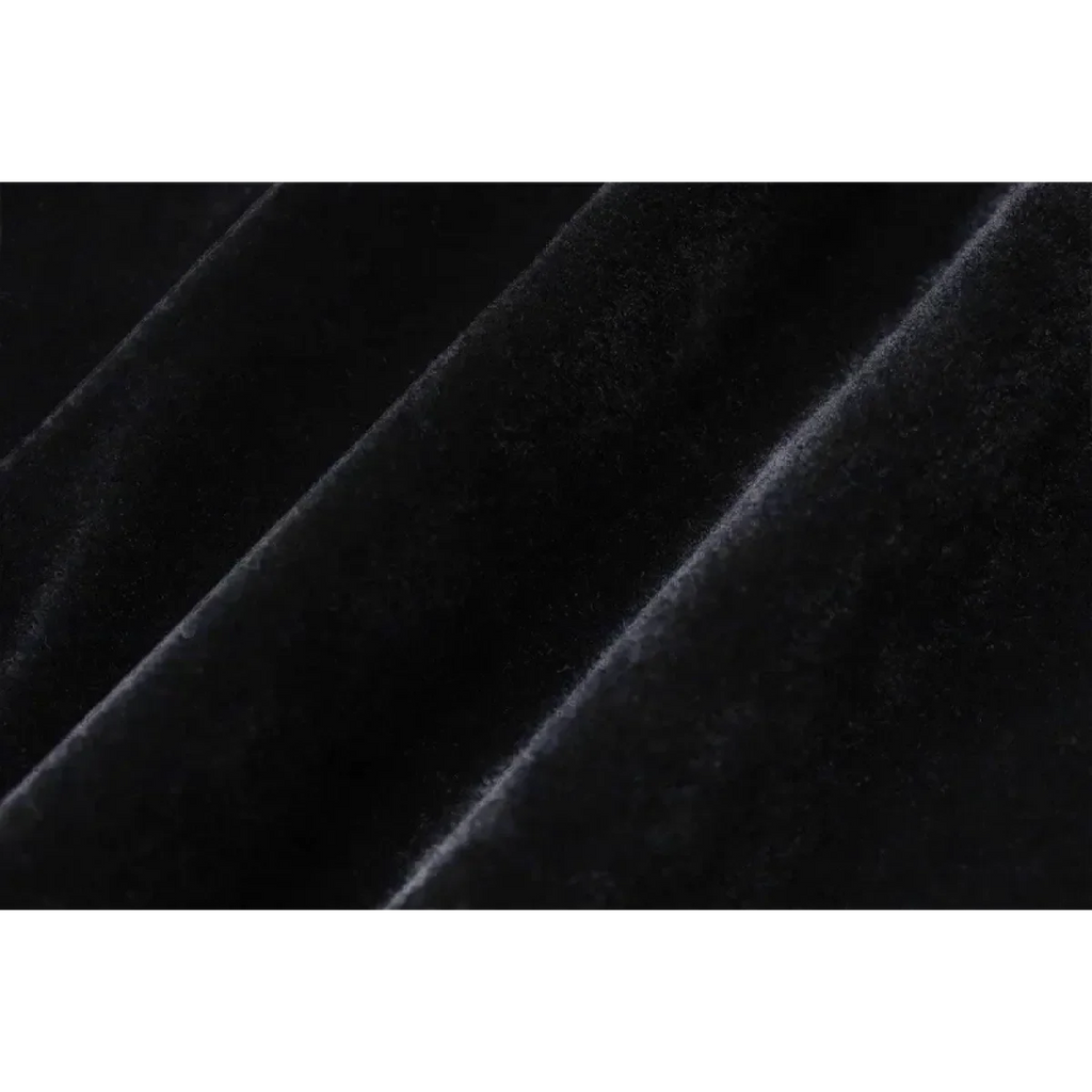 The dress is made of polyester and spandex with a velvet finish, offering a soft yet structured look.