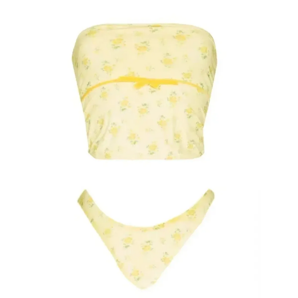 This dazzling bikini set channels serious Spice Girl vibes with its strapless bandeau top and bright yellow floral print. It's a nostalgic nod to '90s girl power, reimagined for your hottest summer ever!