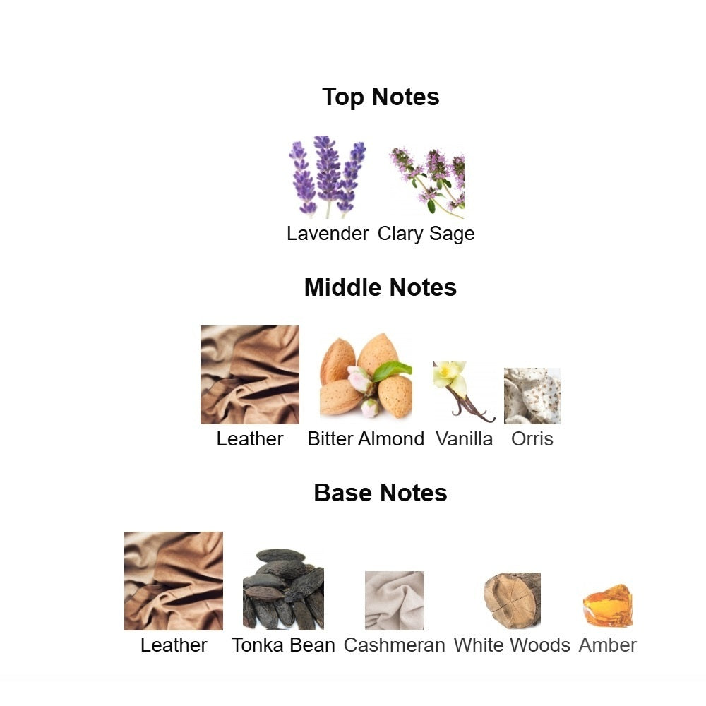 Experience the captivating blend of rich, nutty notes from bitter almond oil, intertwined with the warm embrace of tonka bean and the sophisticated earthiness of orris root. A luxurious foundation of supple leather and the comforting aroma of cashmerean create an aura of undeniable allure, while a hint of clary sage oil adds a touch of invigorating freshness.