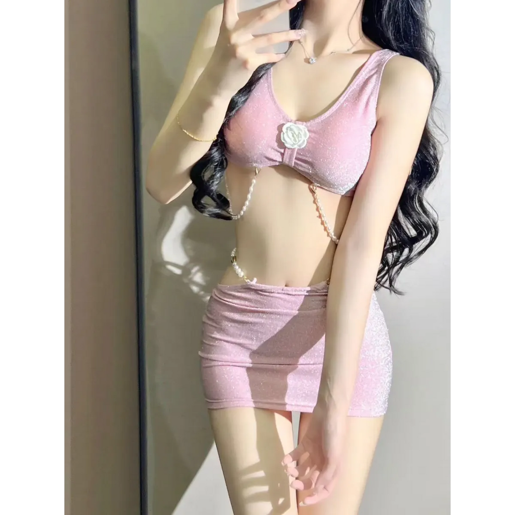 Shine like the star you are in the Glitter 3PC Bikini Set – 3D Flower Top with Pearl Chain Mini Skirt! This ultra-glam set brings high-fashion energy straight to the poolside with its dazzling 3D flower top, glittery low-rise bikini bottom, and the show-stopping pearl chain mini skirt. Whether you're lounging beachside or hitting your fave rooftop pool, this Japan-style swimwear delivers serious sparkle and heat