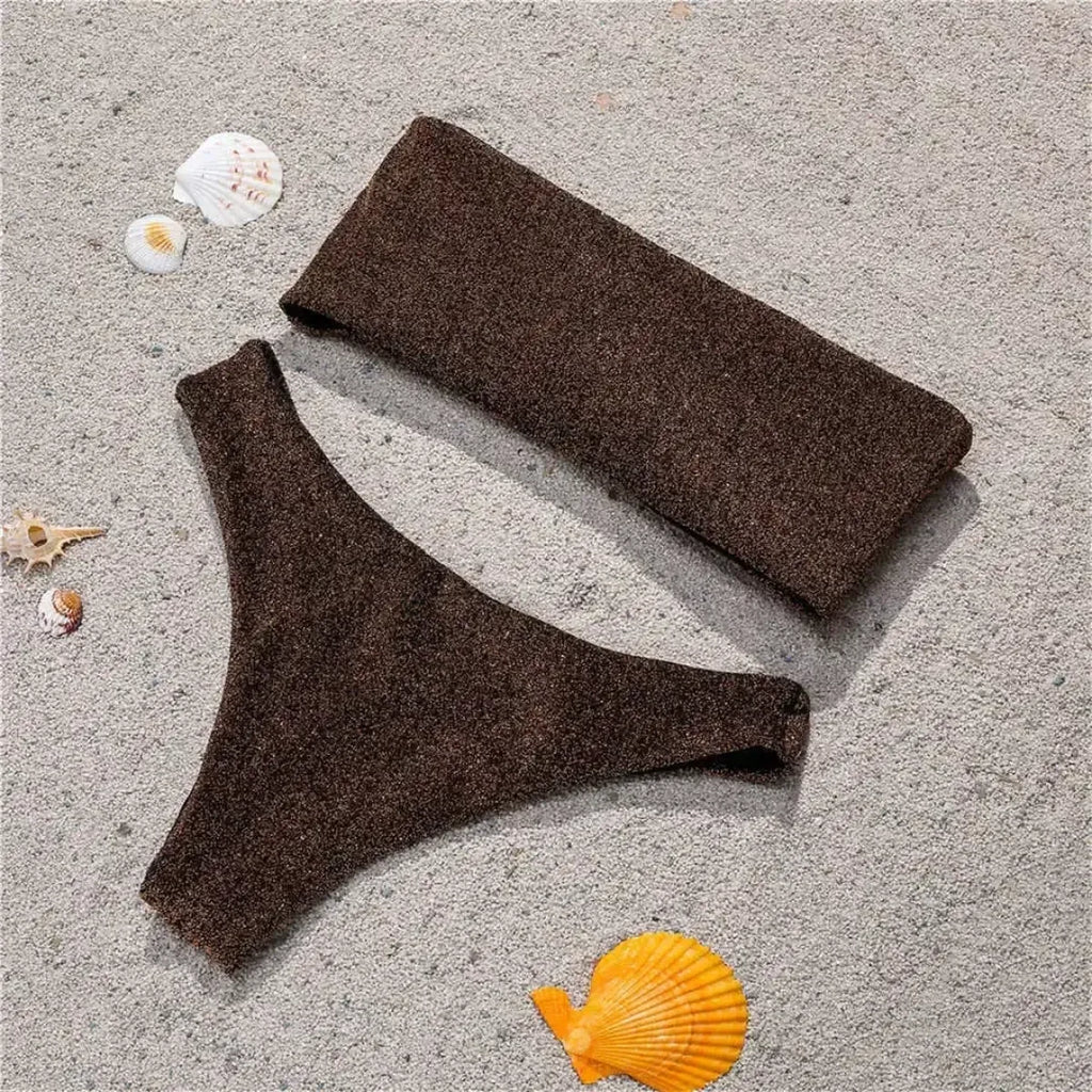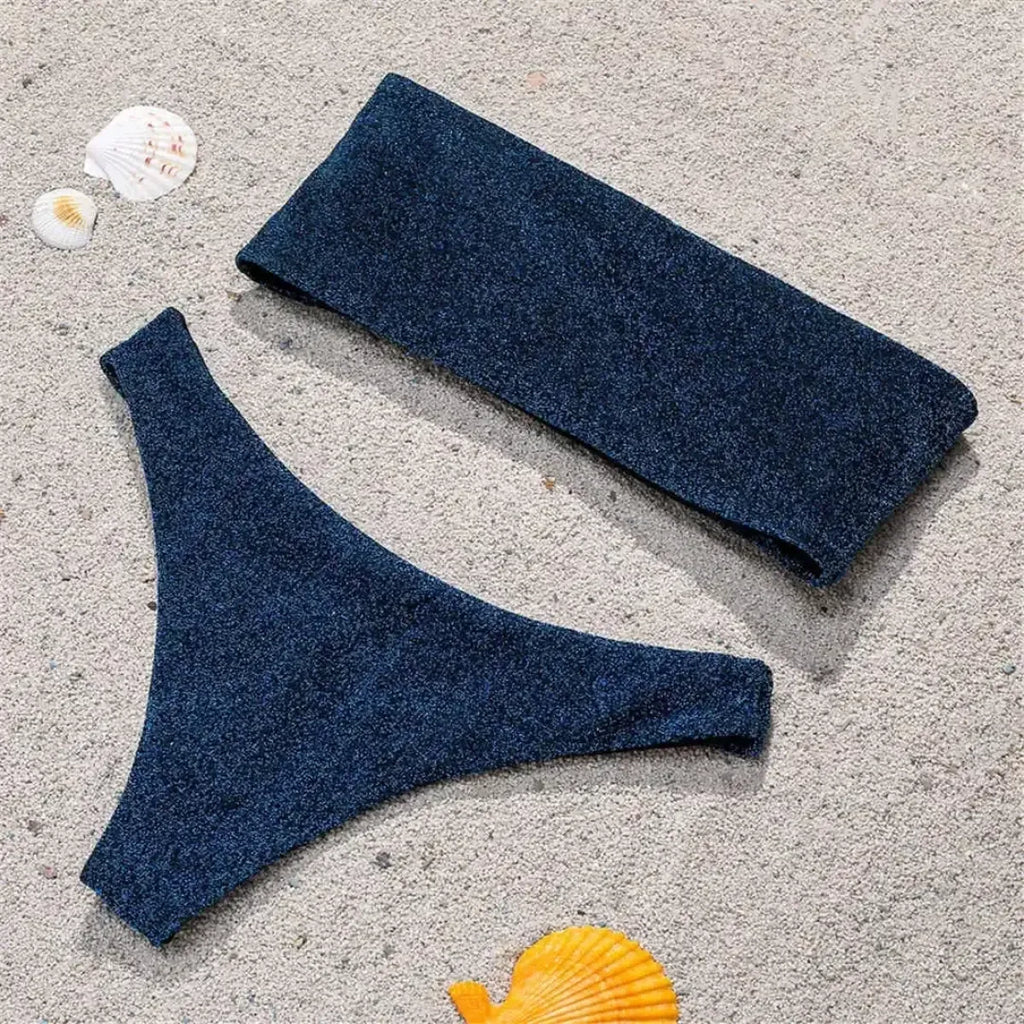 This glittery strapless bikini set brings ultimate sparkle to your beachwear game! With its glimmering texture and sleek bandeau design, this set is made for sun-soaked selfies and making waves.