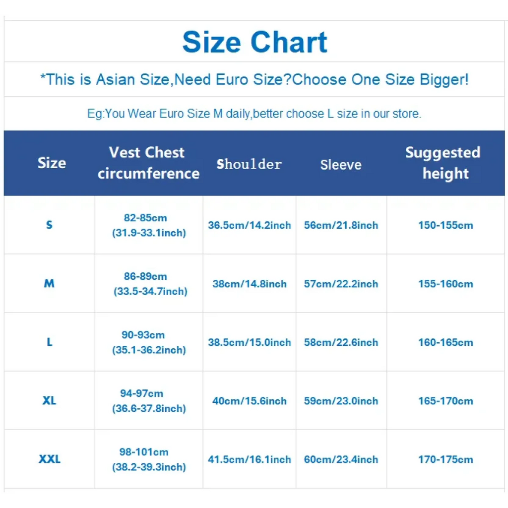 Size | Vest Chest (cm/in) | Shoulder (cm/in) | Sleeve (cm/in) | Suggested Height |