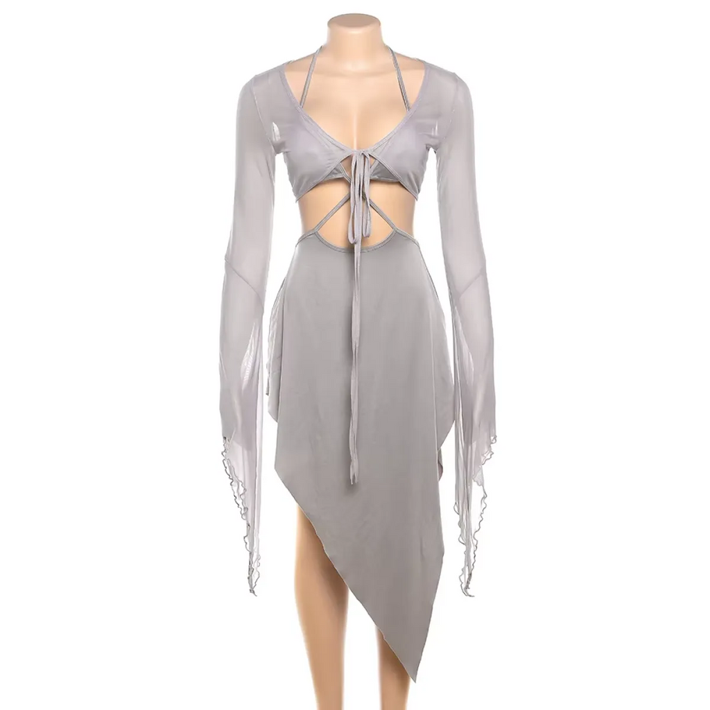 Gray Mesh Two-Piece Set – Halter Cutout Dress & Lace-Up Top