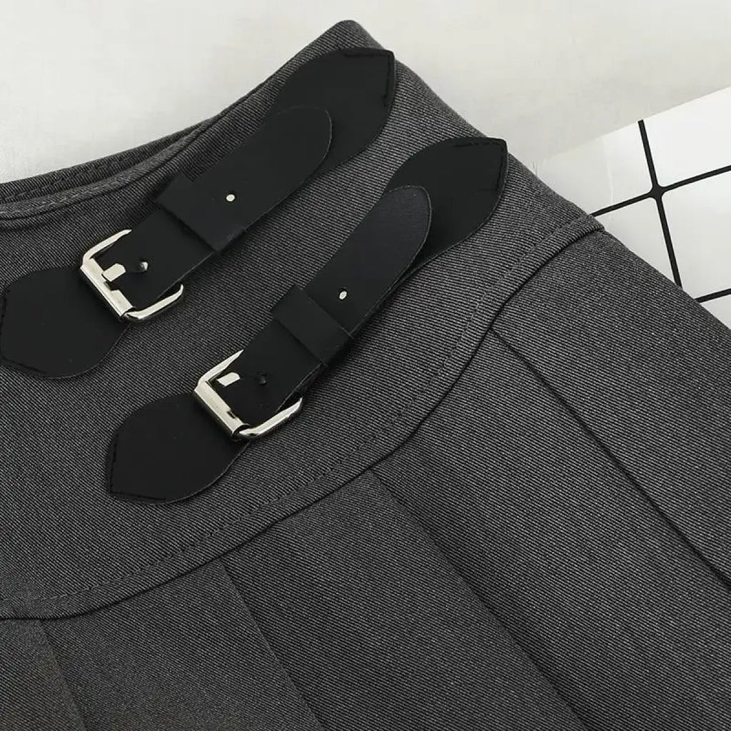 Harajuku Double Belt Pleated Tennis Skirt (Grey/Black)