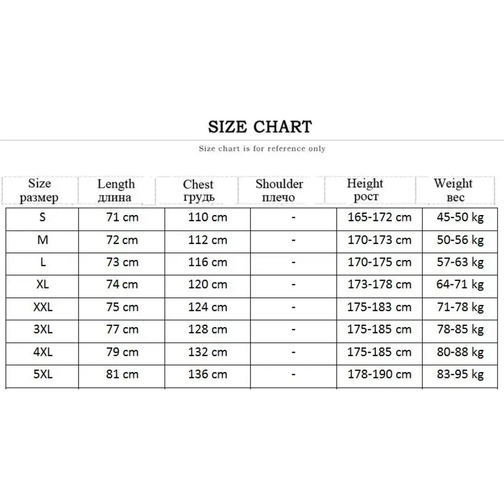 Size | Length (cm) | Chest (cm) | Height (cm) | Weight (kg) |