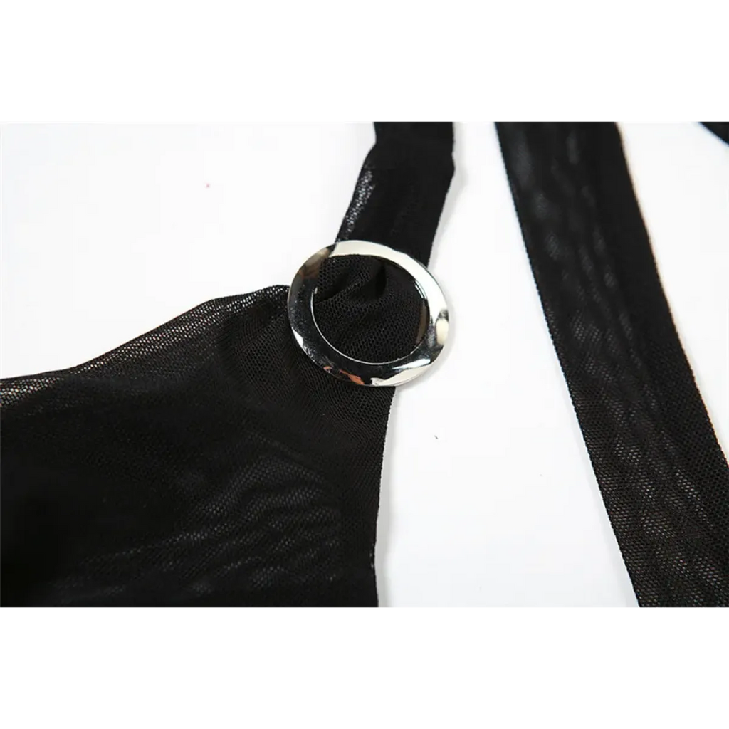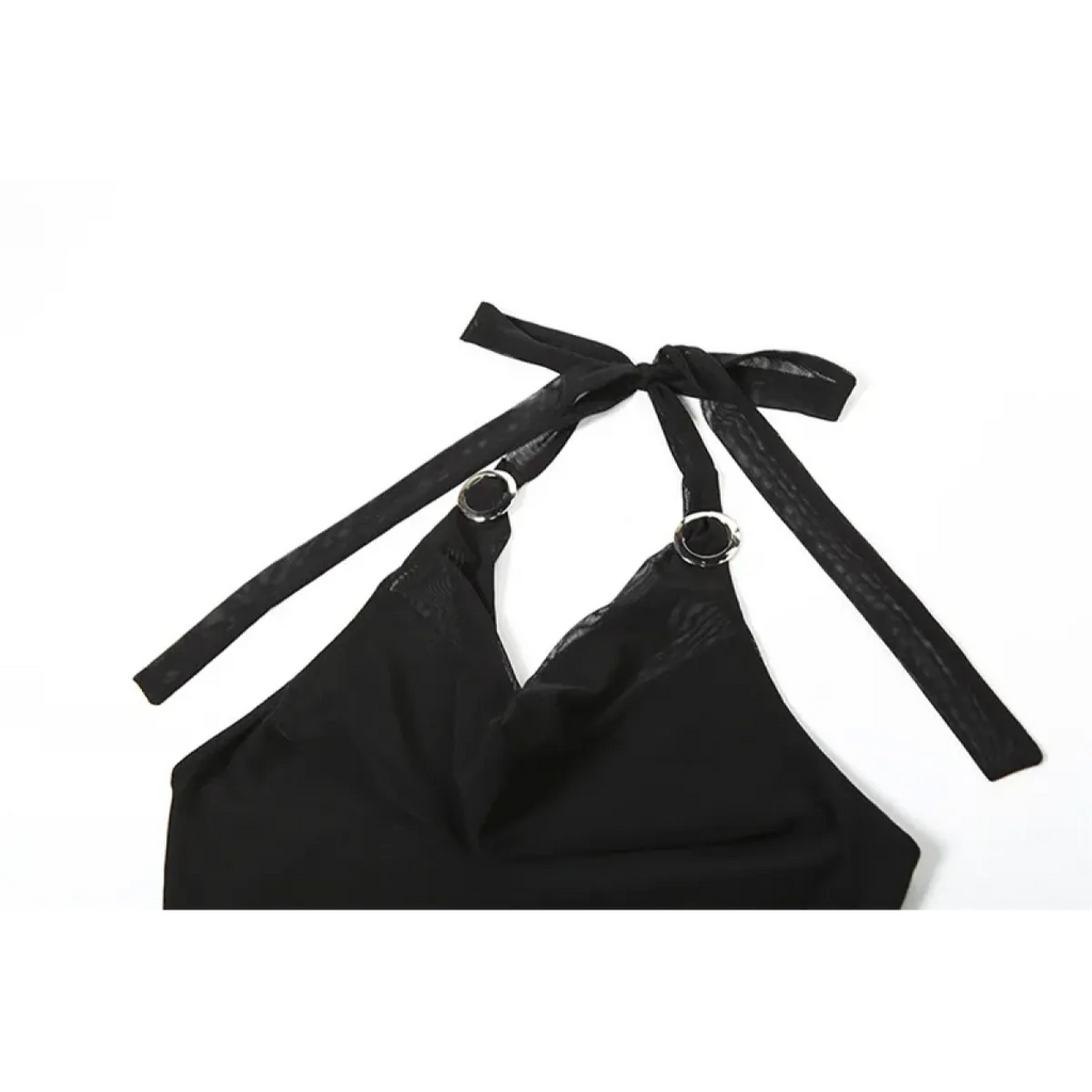 - Halter-style neckline with metal ring accents