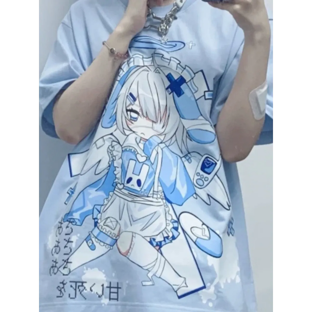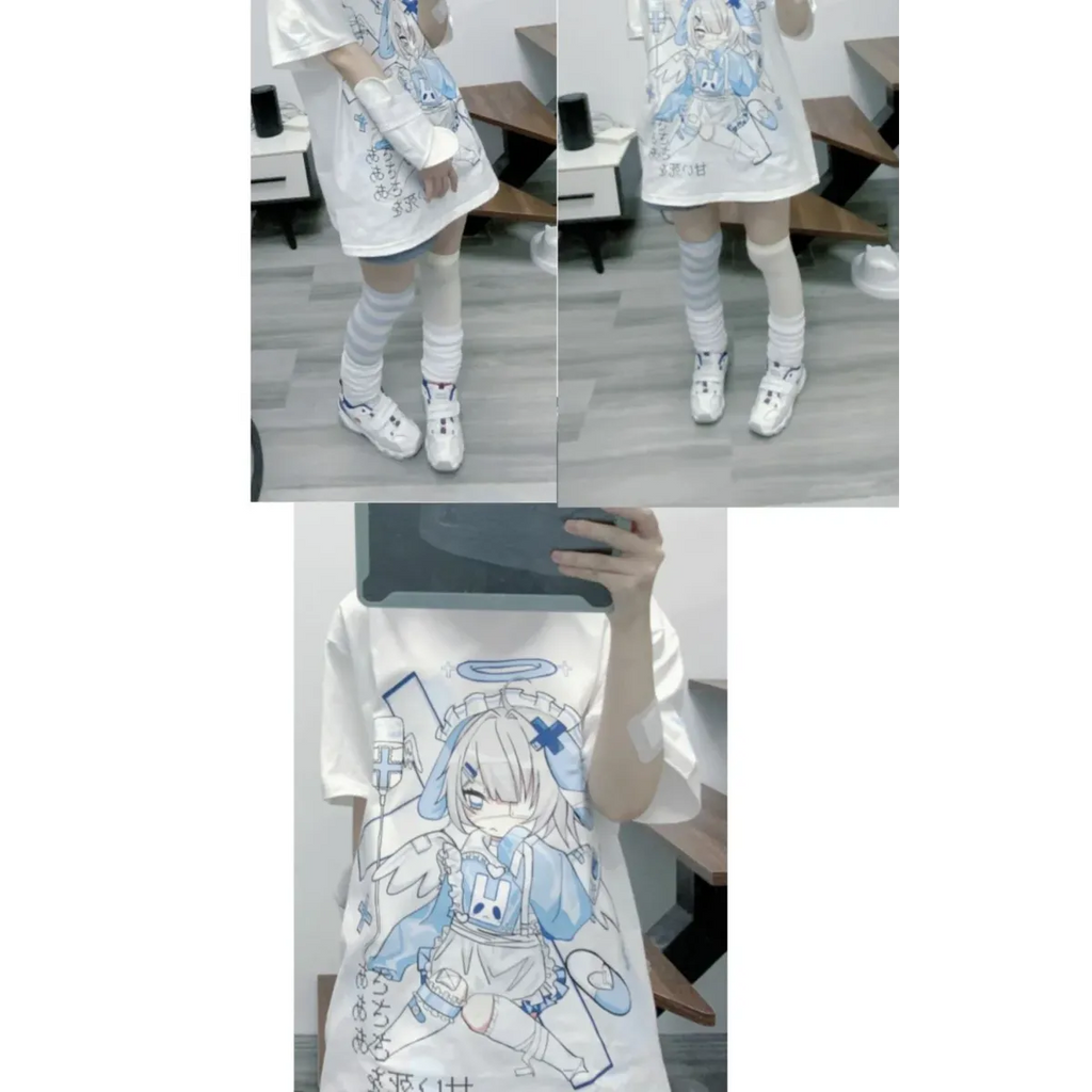 This oversized tee blends the sweet and sassy charm of kawaii anime with edgy Harajuku energy. Featuring a detailed print of a melancholic angel girl with halo, wings, and game-inspired accessories, it's a wearable piece of art for lovers of soft grunge and Japanese pop culture.