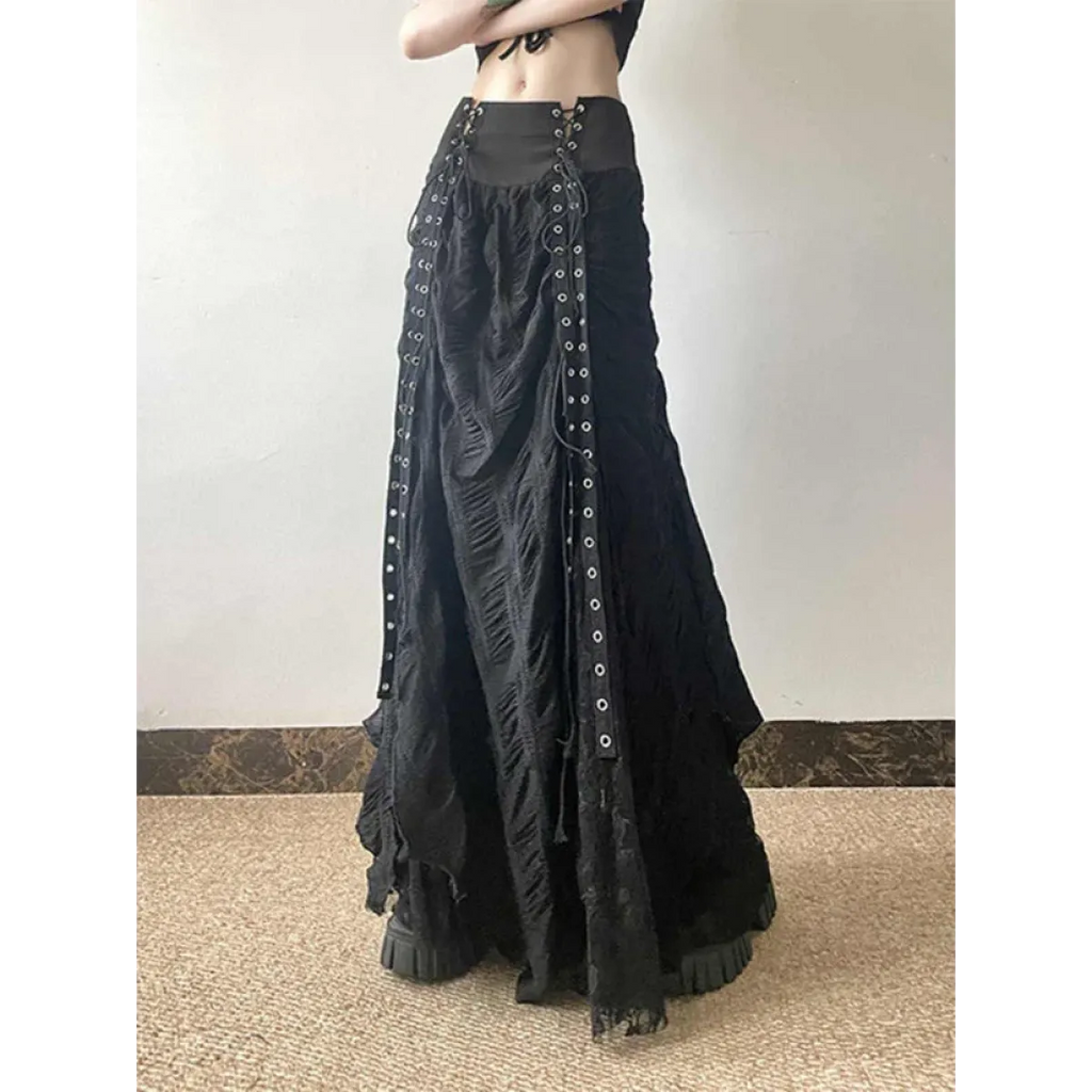 This magical A-line skirt blends Harajuku flair with gothic romance—featuring cascading lace, ribbon accents, and a flowy ankle-length cut that moves like a dream. Whether you're dancing at twilight or owning your street style, this skirt is a standout piece made to enchant.