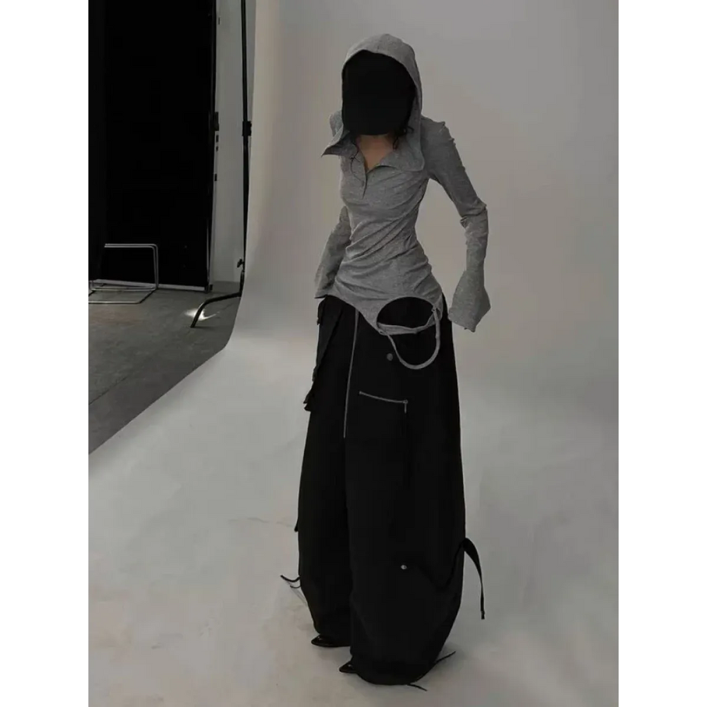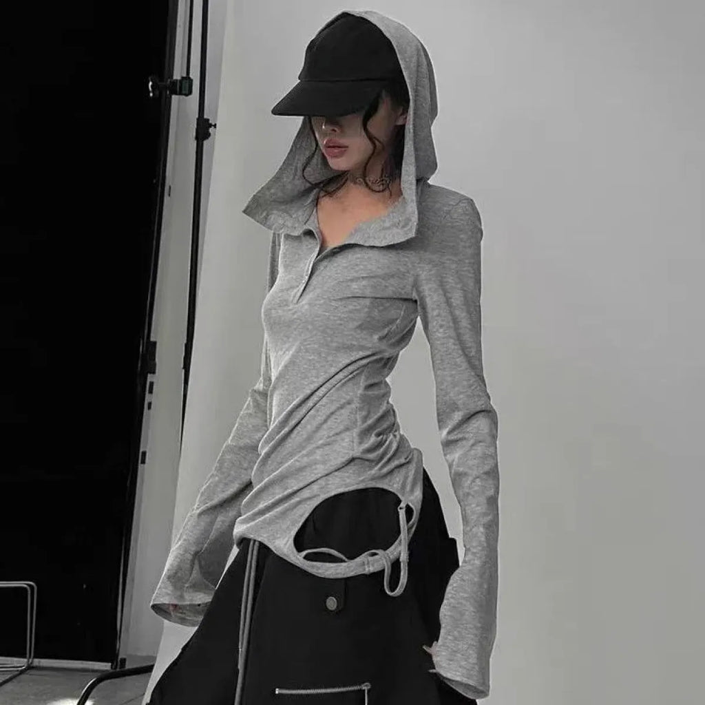 The Harajuku Punk Style Hooded Shirt is a slim-fit long sleeve top featuring a distressed hooded design, perfect for edgy streetwear looks.