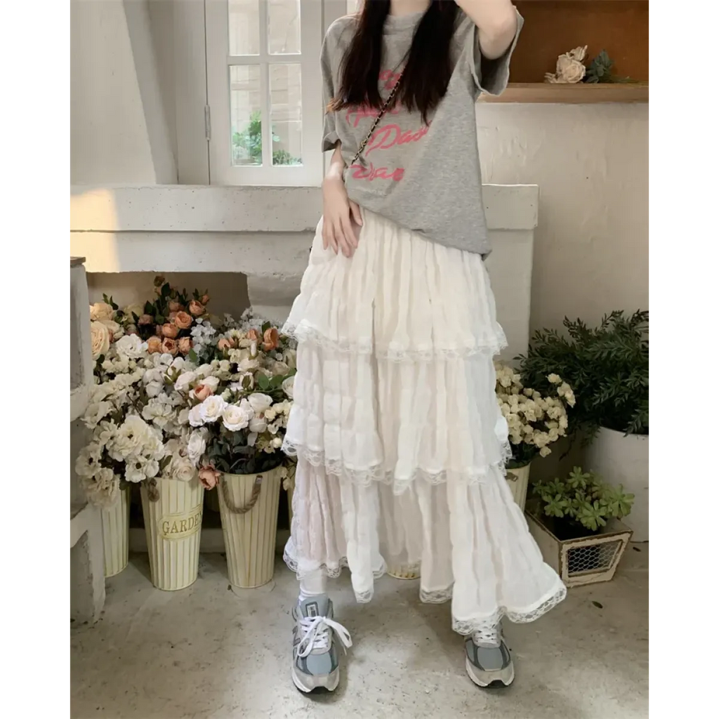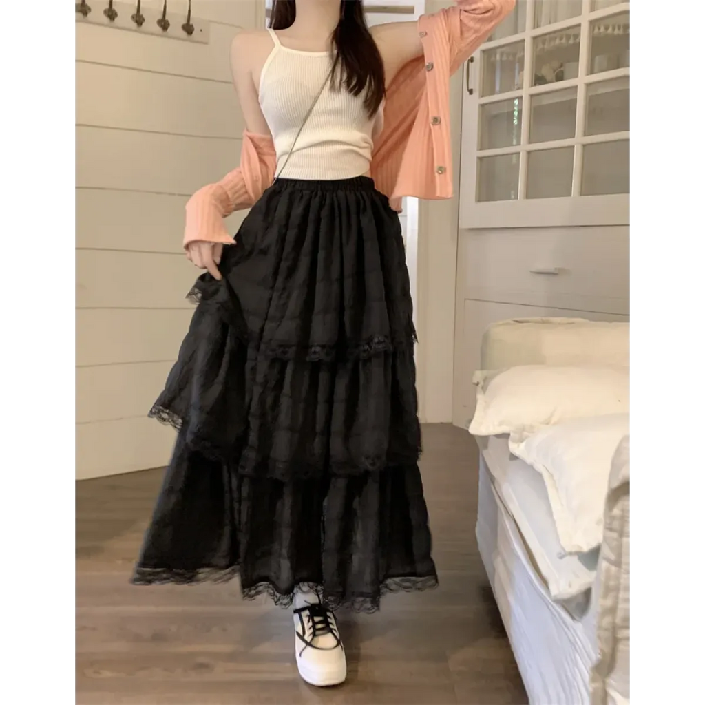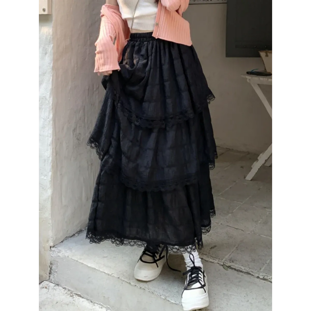 This enchanting mid-calf skirt brings together gothic flair and soft femininity with its layered lace ruffles and empire waistline—ideal for twirling through sunny days or moonlit strolls in style.
