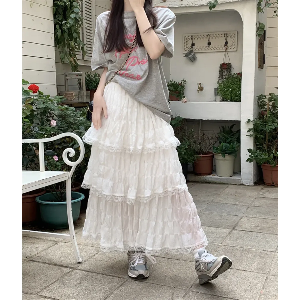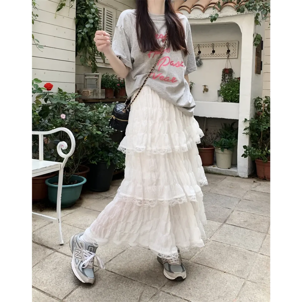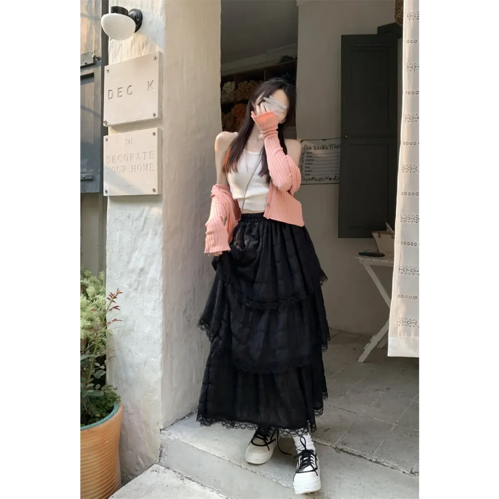 This enchanting mid-calf skirt brings together gothic flair and soft femininity with its layered lace ruffles and empire waistline—ideal for twirling through sunny days or moonlit strolls in style.
