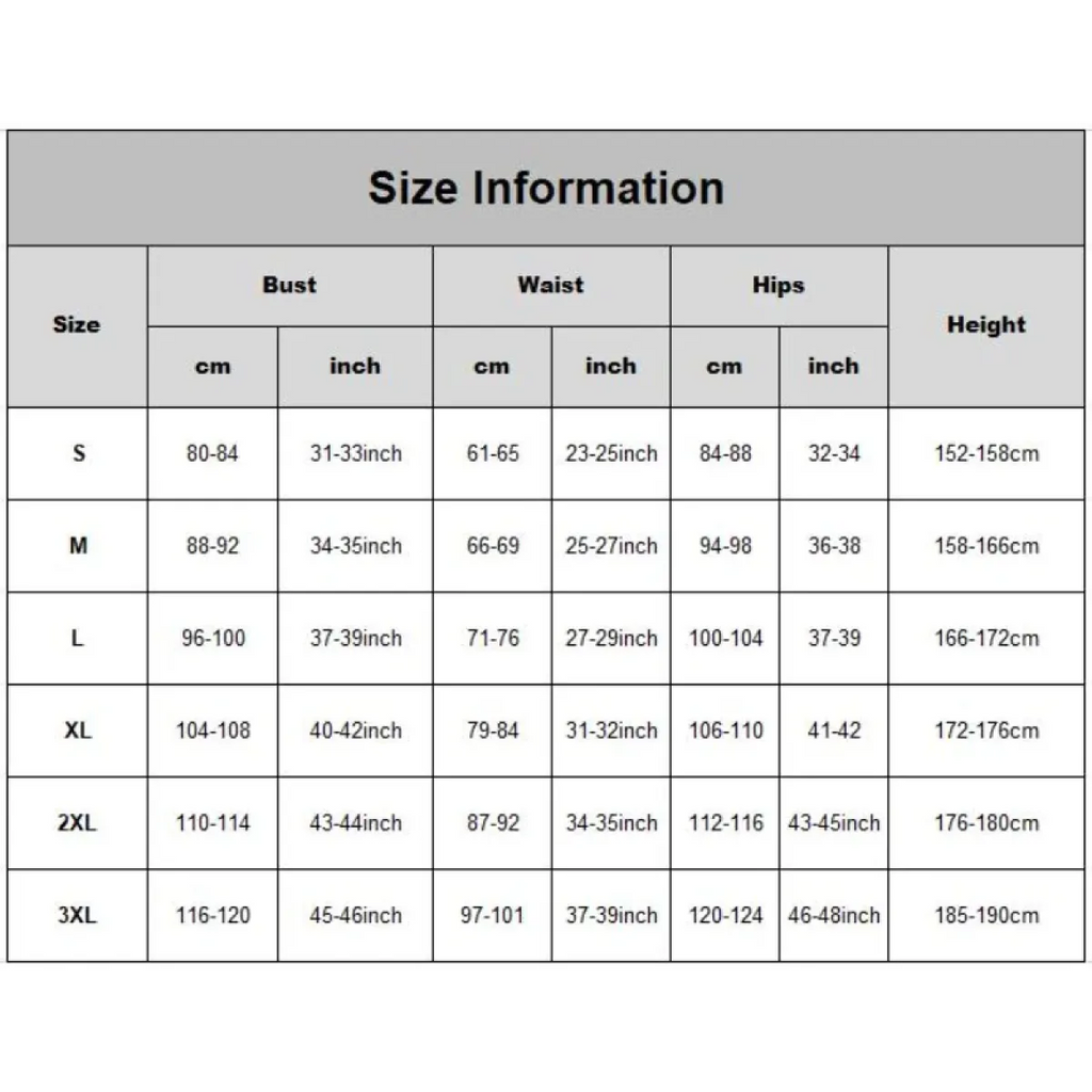 Size | Bust (cm/inch) | Waist (cm/inch) | Hips (cm/inch) | Height (cm) |