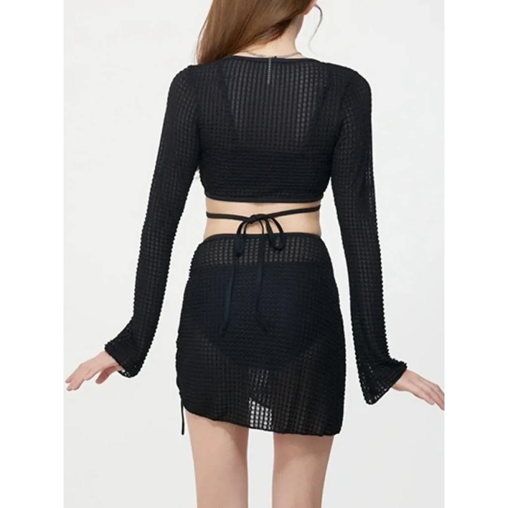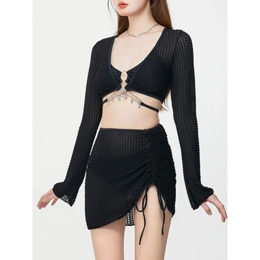 Float into summer with the Ivory Mesh Chain Bikini Set—a dreamy, coordinated swimwear trio featuring a long sleeve lace-up crop top, low waist bikini bottoms, and a ruched mesh mini skirt. With its soft ivory palette, delicate texture, and charming beaded chain detail, this set is made for seaside selfies and poolside posing.