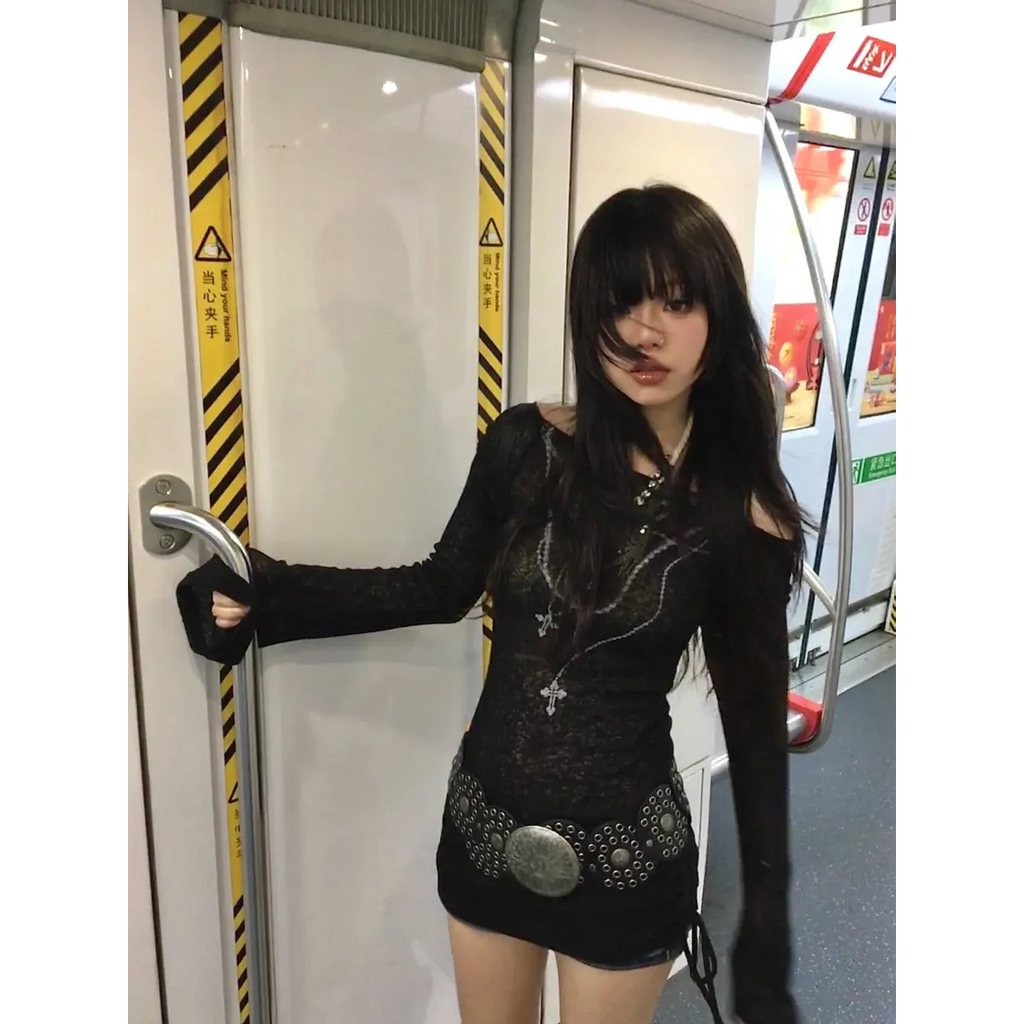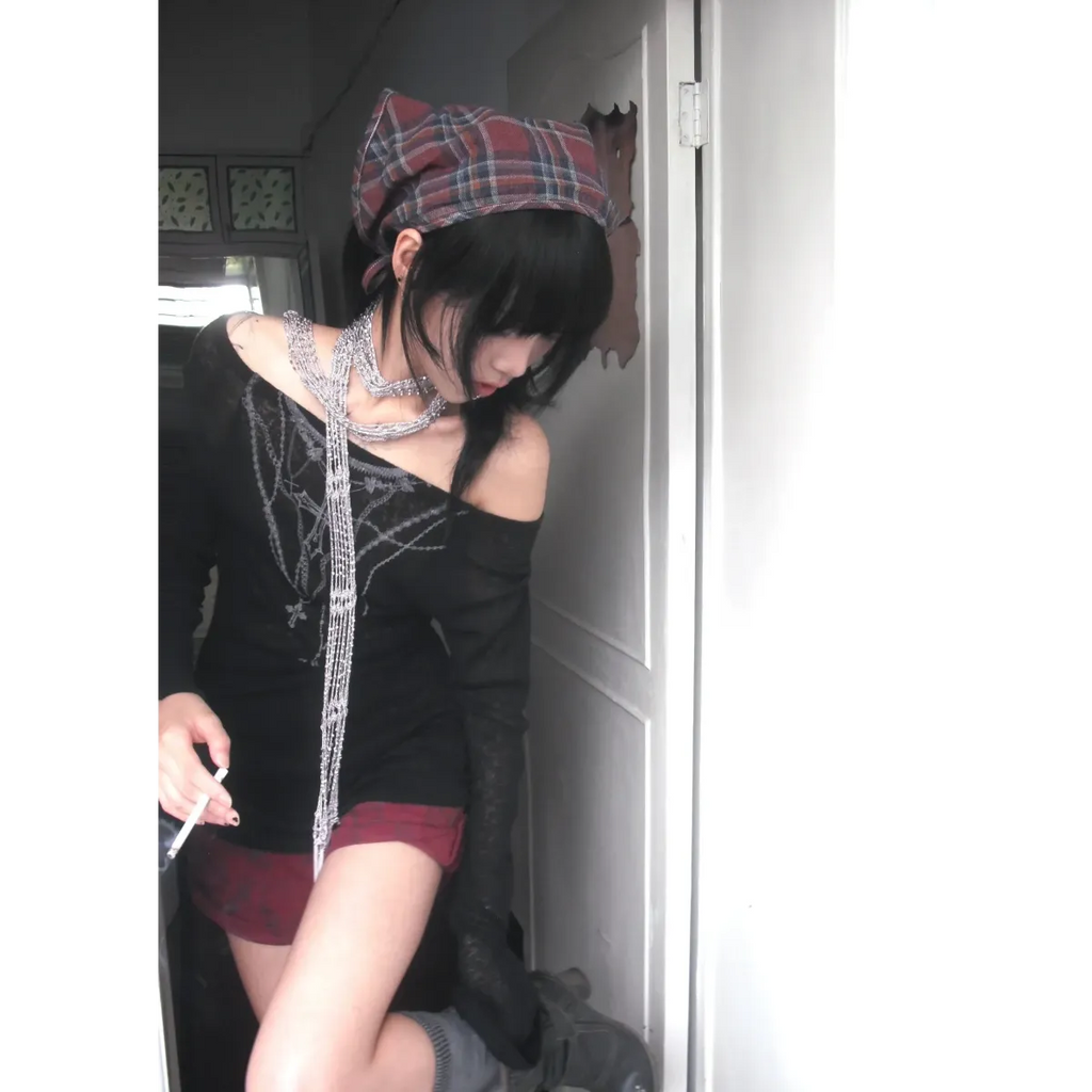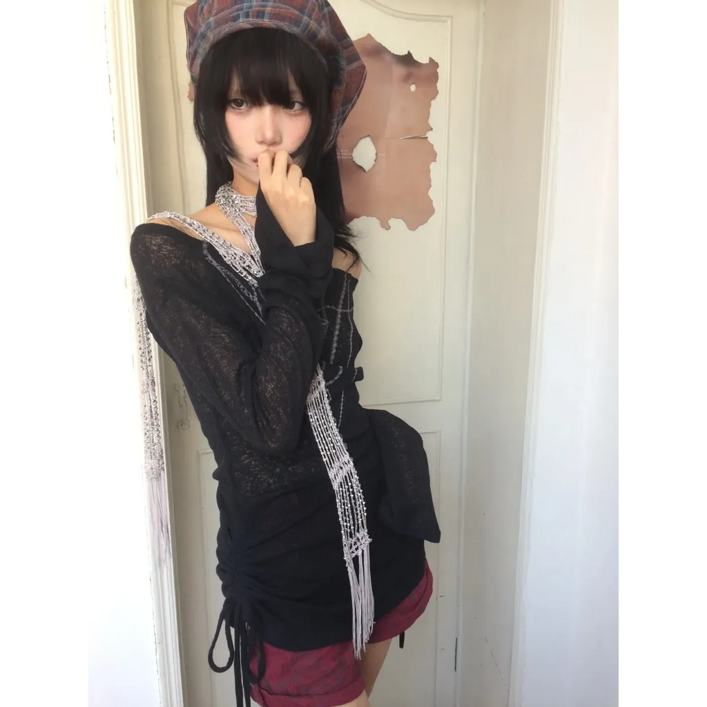 Step into the world of Y2K fashion with our Japanese Knitted Grunge Tattoo Print Long Sleeve T-shirt! Embrace your inner rebel with this edgy yet stylish top featuring a unique tattoo print design. Crafted from high-quality knitted cotton material, this long sleeve tee offers both comfort and durability, making it perfect for the autumn/winter season. The Y2K-inspired style adds a nostalgic touch to your wardrobe, while the slash neck collar adds an extra element of grunge. The shirring decoration and high stretch elasticity ensure a flattering fit that accentuates your curves. Whether you're channeling your favorite fairy tale character or simply expressing your individuality, this tee is a must-have for any fashion-forward woman's collection.