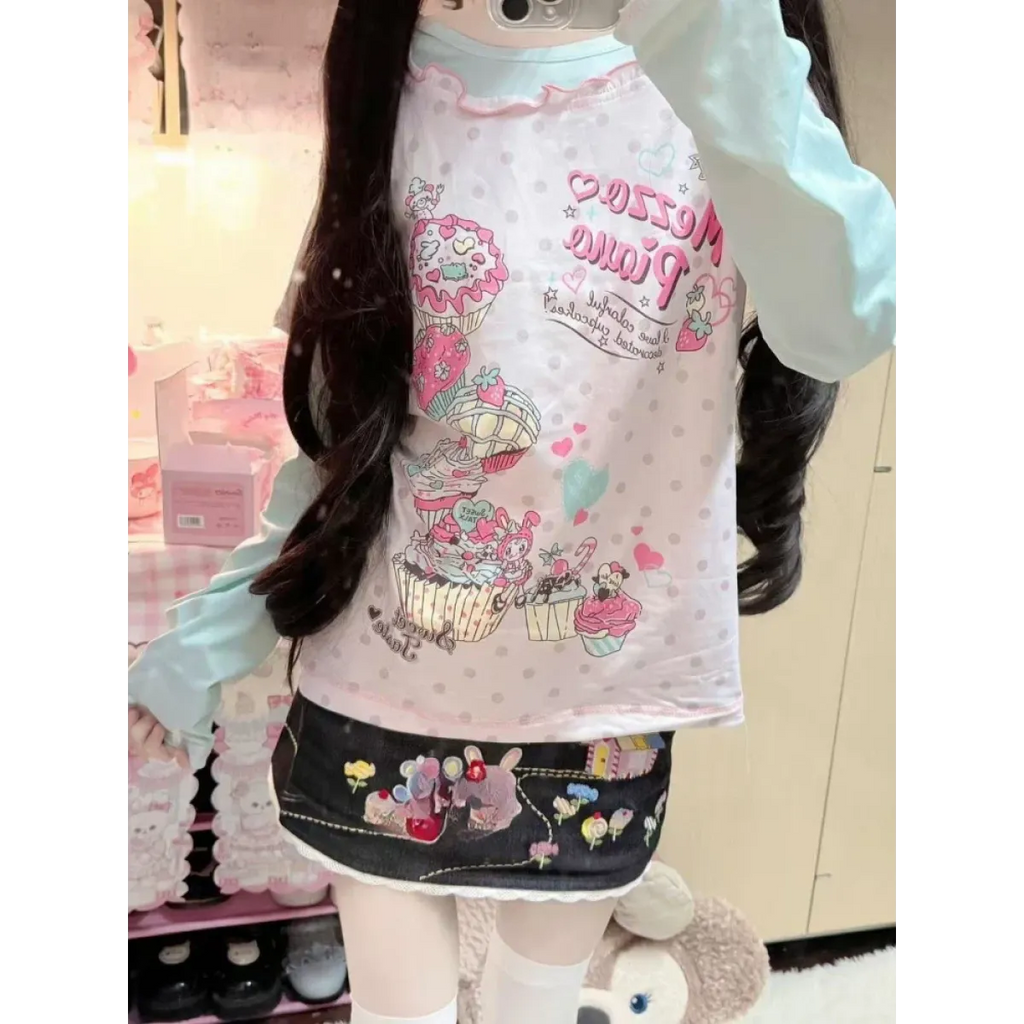 Kawaii Cupcake Print Top – Y2K Harajuku Long Sleeve Shirt
