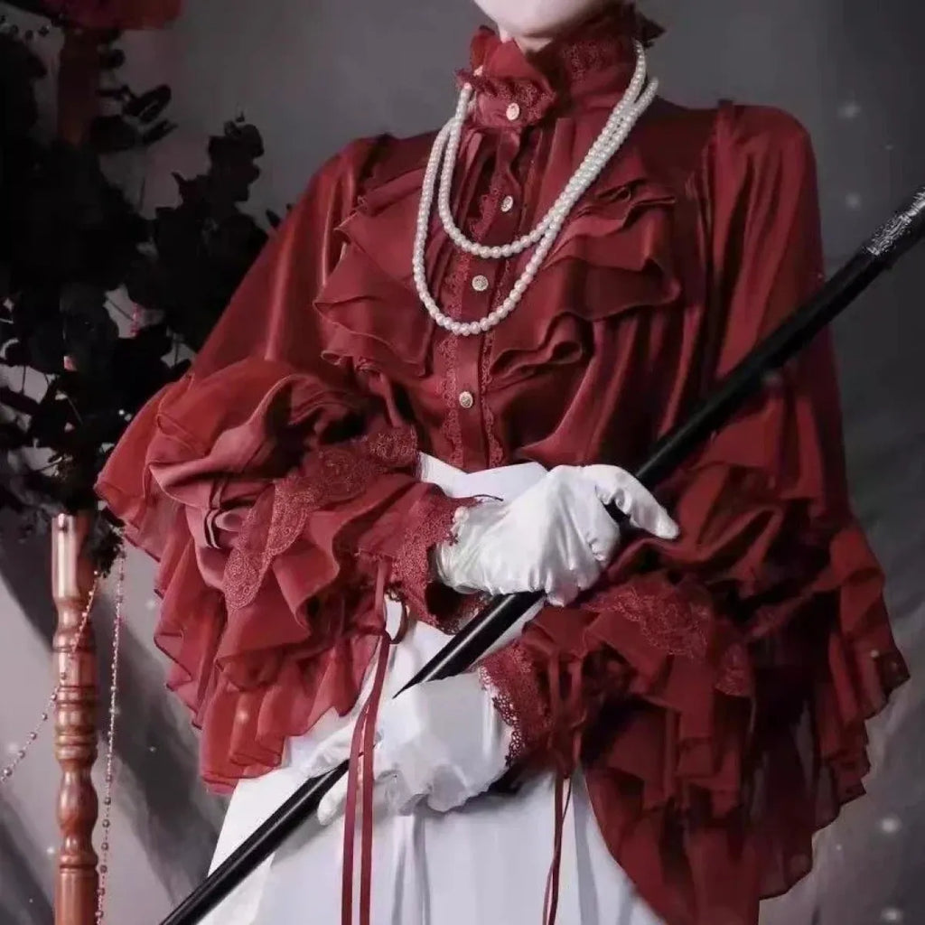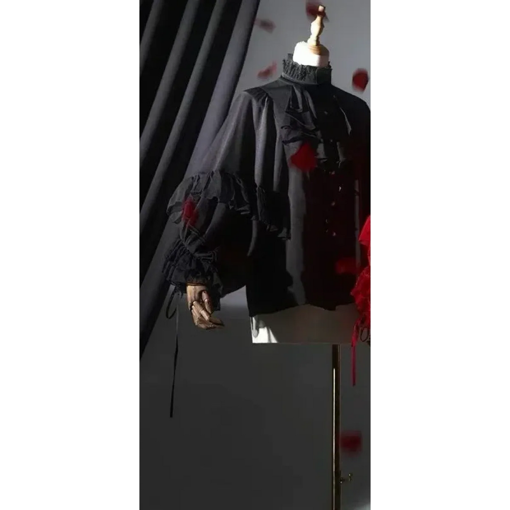 Pair with a high-waisted skirt or trousers, layered pearls, and a cape for a full aristocratic Lolita look—or tuck into a pleated mini for a modern girly-goth twist.