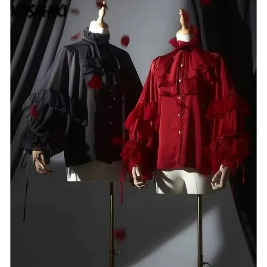 This ethereal Lolita blouse transforms any outfit with its voluminous lace-trimmed lantern sleeves and high ruffled collar. It’s a statement piece that whispers Victorian dreamcore with a touch of gothic flair.