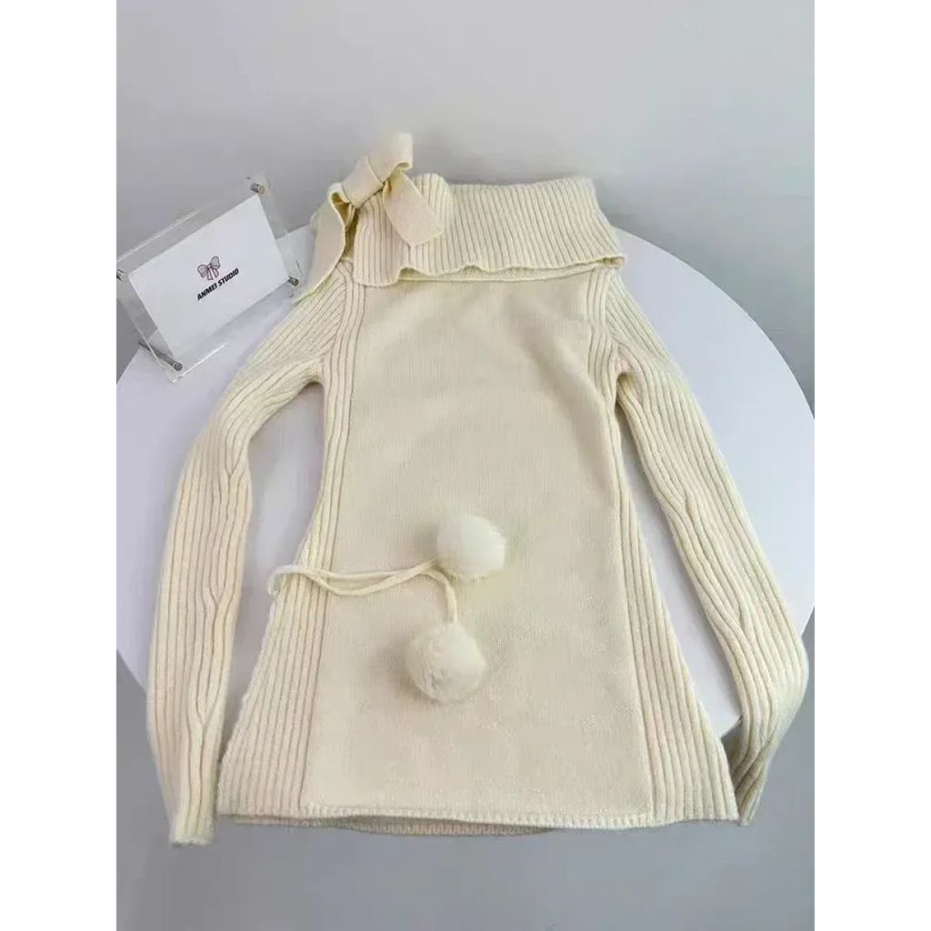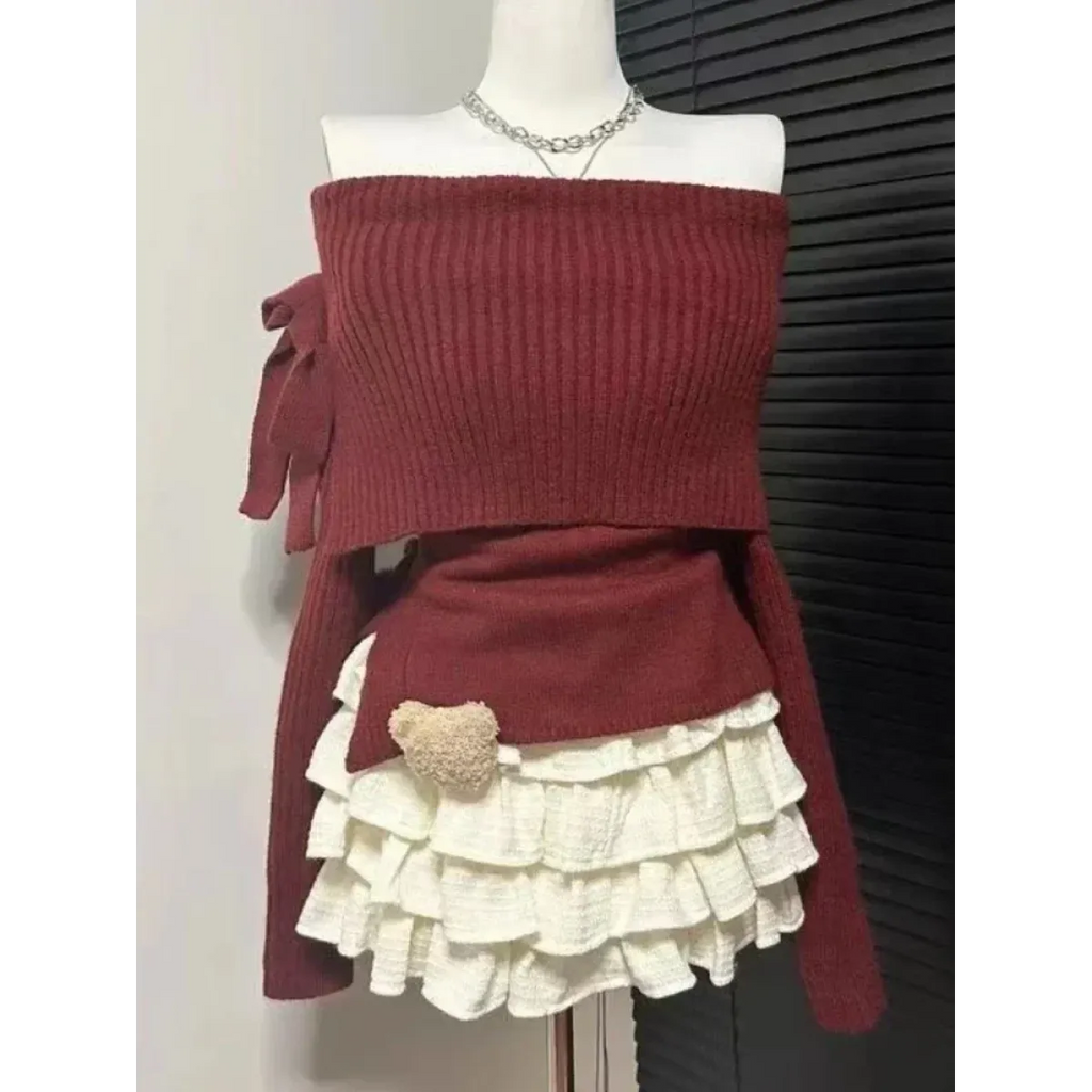 This adorable set blends soft knit warmth with frilly lace charm. Featuring a ribbed off-shoulder top with pom-pom ties and a ruffled mini skirt, it's a magical mix of comfort and cuteness for chilly seasons.