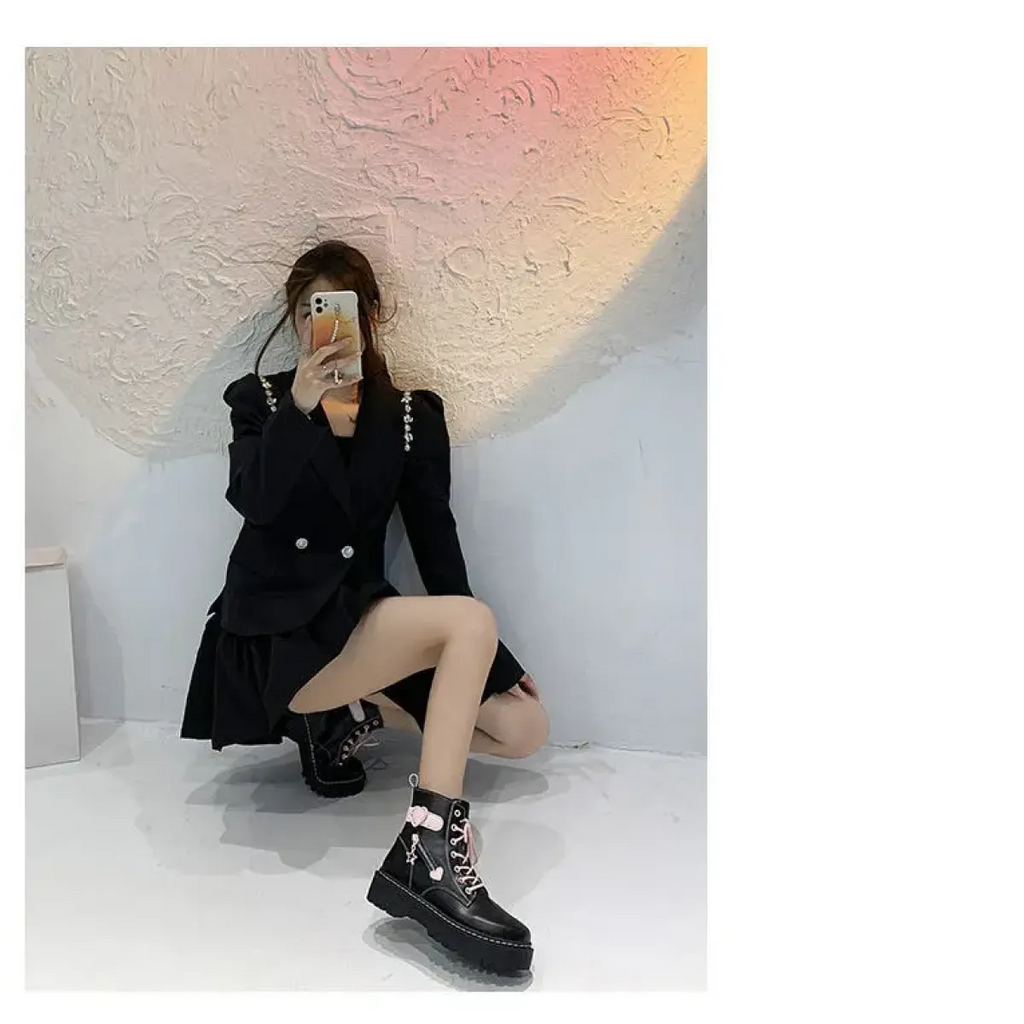 Step into a world of pastel punk with these Kawaii Platform Boots! With their bold black PU leather base, bubblegum pink laces, and adorable heart-shaped details, these boots serve up major attitude with a sweet twist. The sturdy 4cm platform heel gives you a height boost while keeping things comfy for all-day wear.