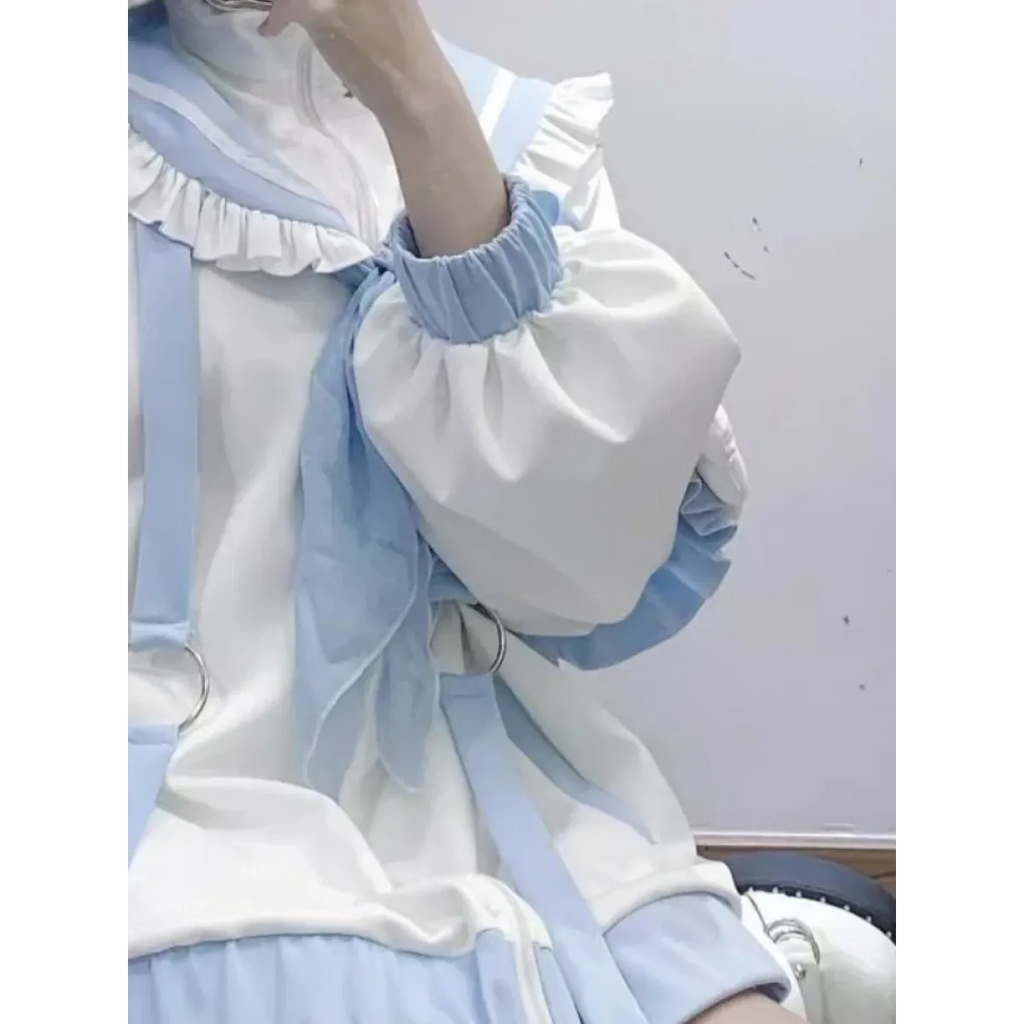 This dreamy pastel hoodie set blends sailor aesthetics with frilly cuteness to create a look that’s sweet, unique, and totally stand-out. The oversized hoodie paired with frilled shorts and suspender leg covers make this set an instant head-turner for any kawaii fashion lover.