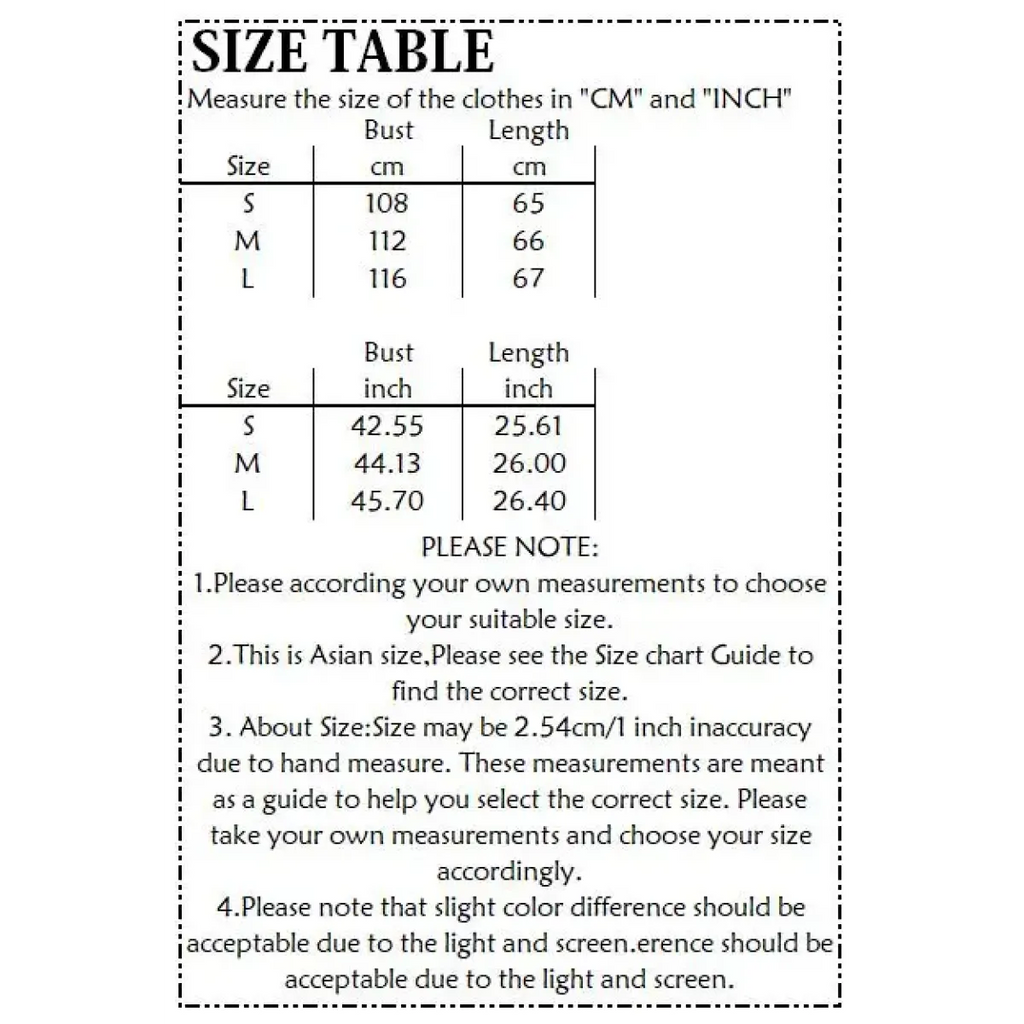 Size | Bust (in) | Length (in) | Sleeve Length (in) |
