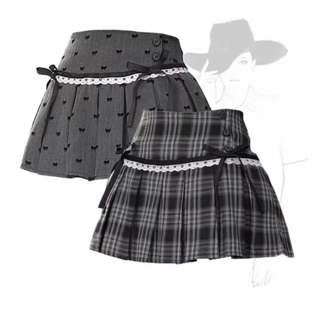 Kawaii Y2K Pleated Mini Skirt – Japanese Bow Lace Plaid Chic