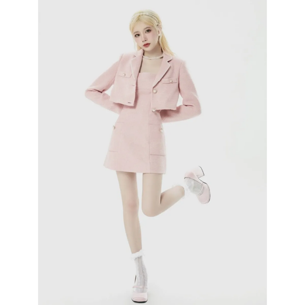 The low price casts some doubts. Do you save on the quality of the Pink Korean Style Two Piece Set for Women: Kawaii Sweet Party Mini Dress and Long Sleeve Coat?