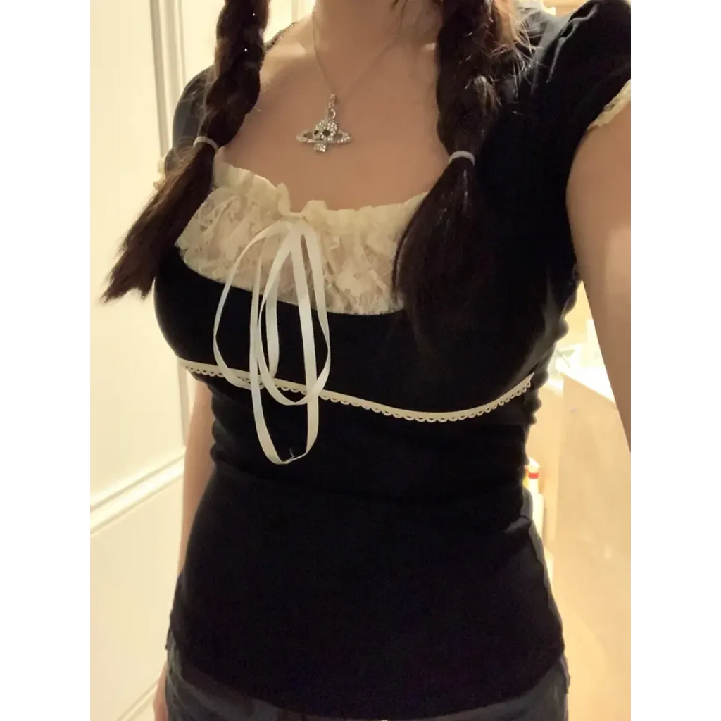 🌸 Introducing: Lace Trim Crop Top - Sweet Square Neck Harajuku Tee