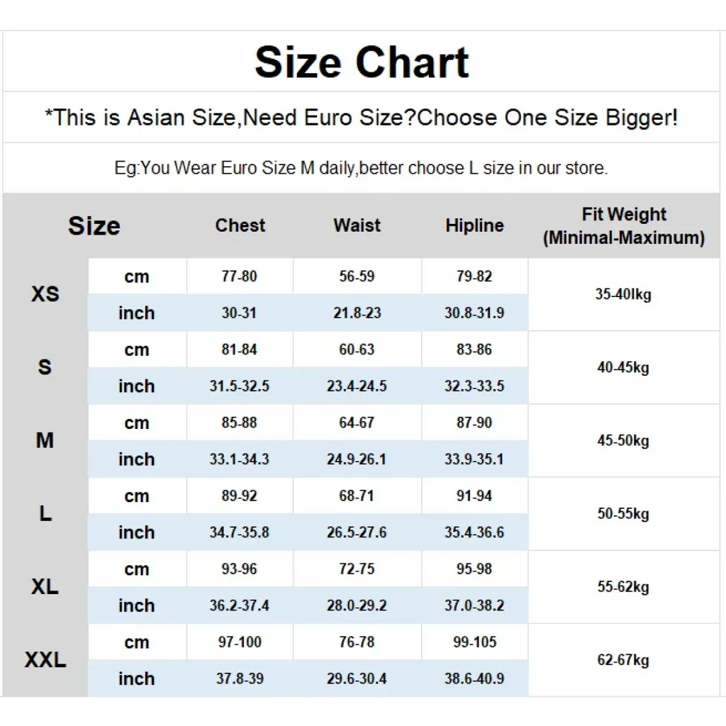 Size | Chest (cm/in) | Waist (cm/in) | Hipline (cm/in) | Fit Weight (kg) |
