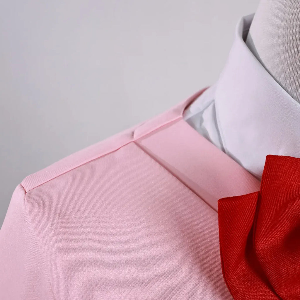 - Includes pink knit v-neck sweater, pleated navy skirt, white collar shirt, and red bowβjust like Momoβs!