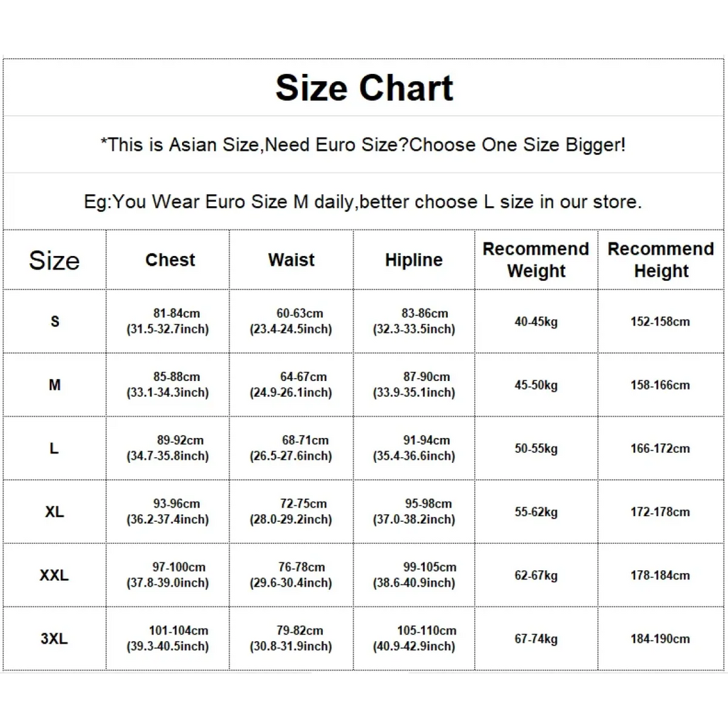 Size | Chest (cm/in) | Waist (cm/in) | Hipline (cm/in) | Recommended Weight | Recommended Height |