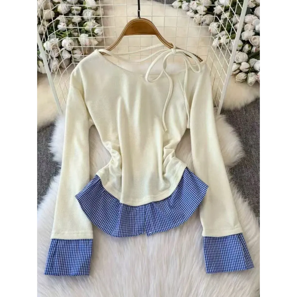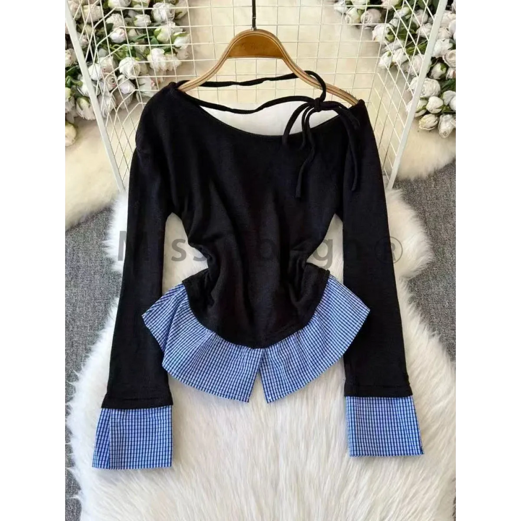 Off-Shoulder Plaid Patchwork Top – Harajuku Retro Style