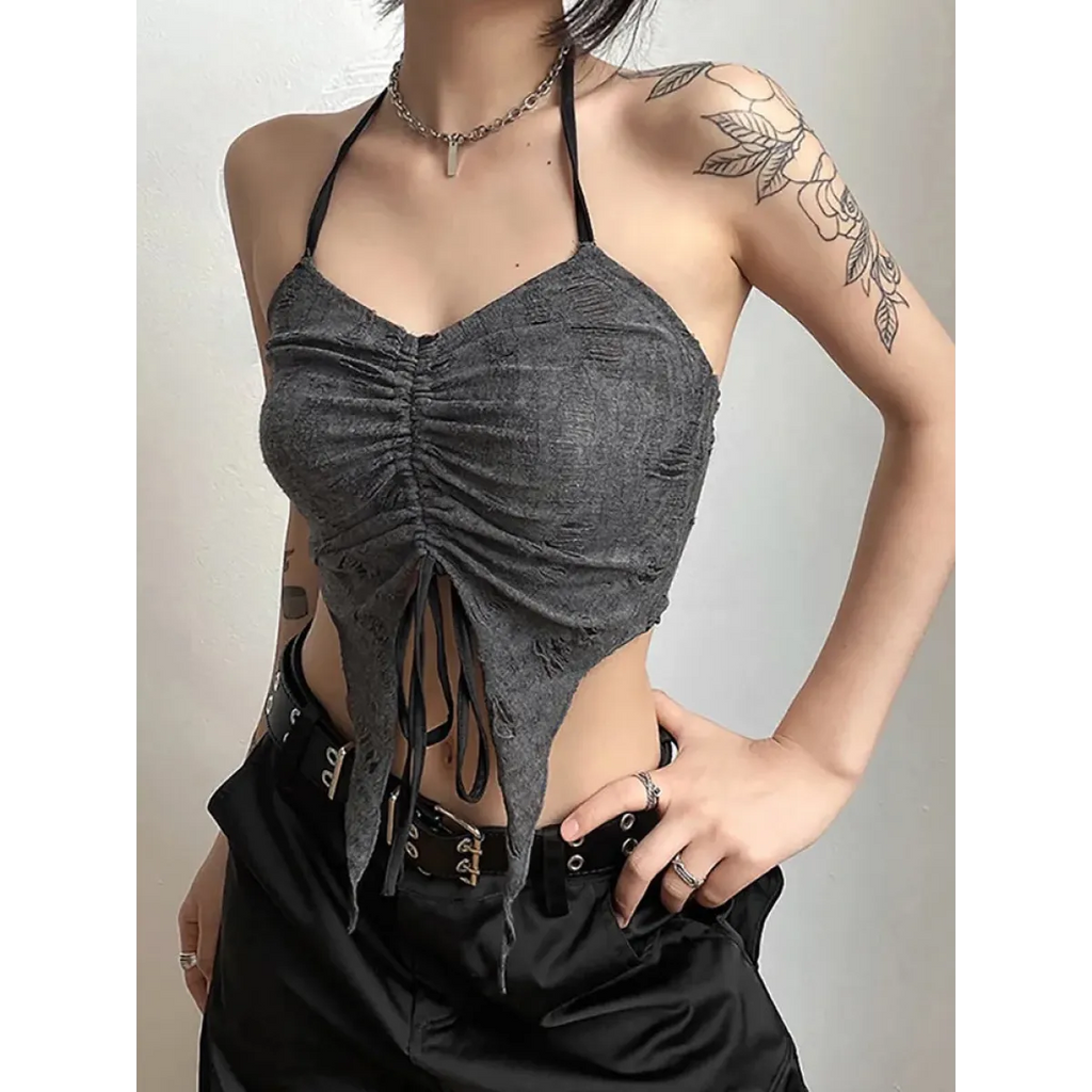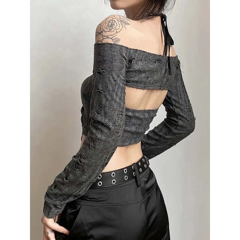 V-Neck Collar: The V-neck design adds a touch of feminine elegance to this edgy ensemble.