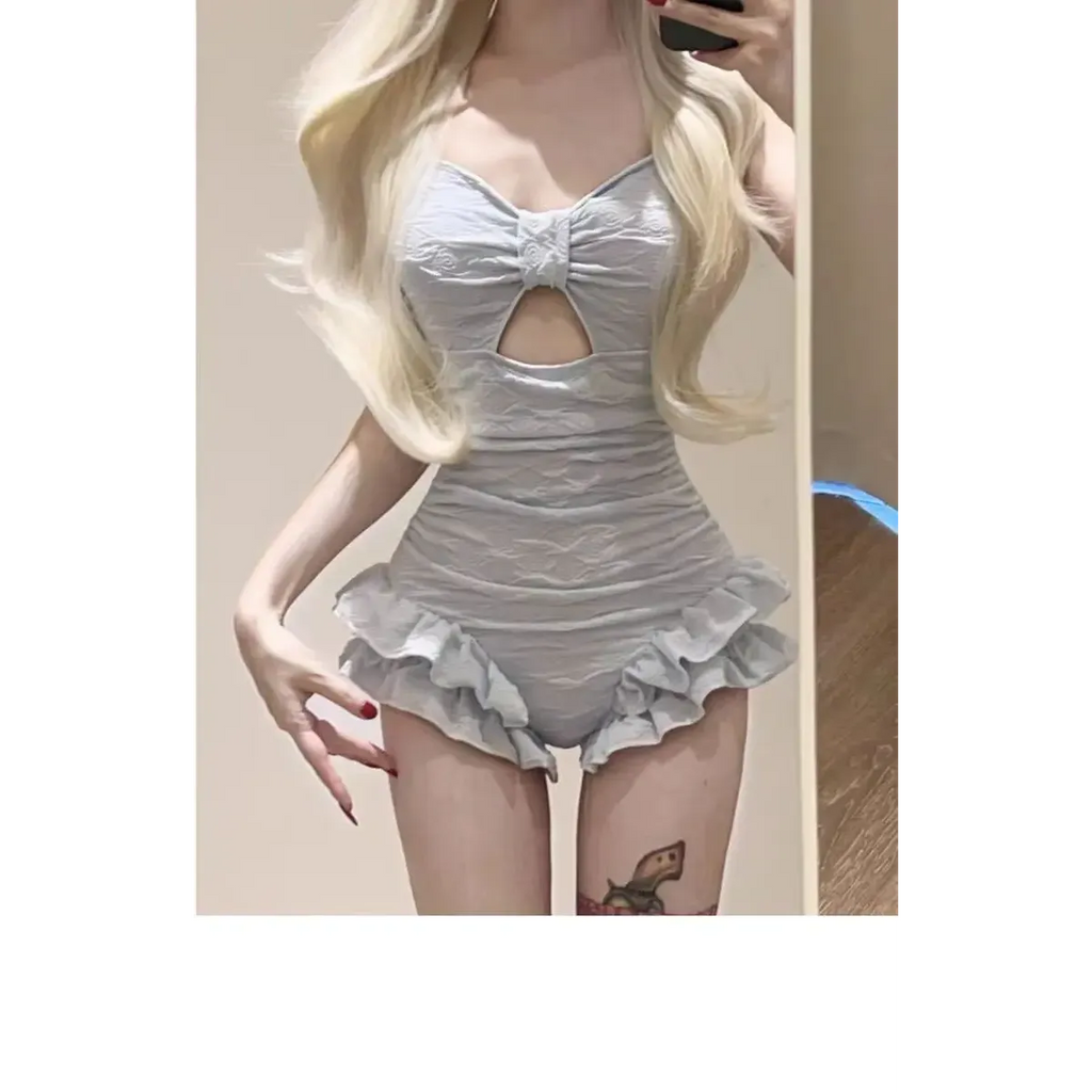 • 🌸 Style: Youthful Japanese style with ruffle trim and ruched bodysuit silhouette