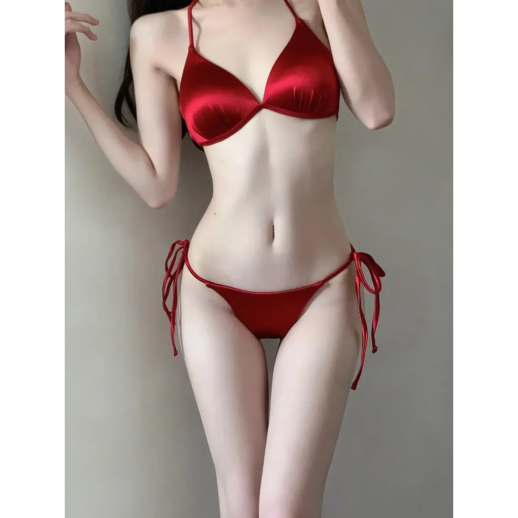 Satin Halter Bikini Set – Korean 3PCS Swimsuit with Skirt