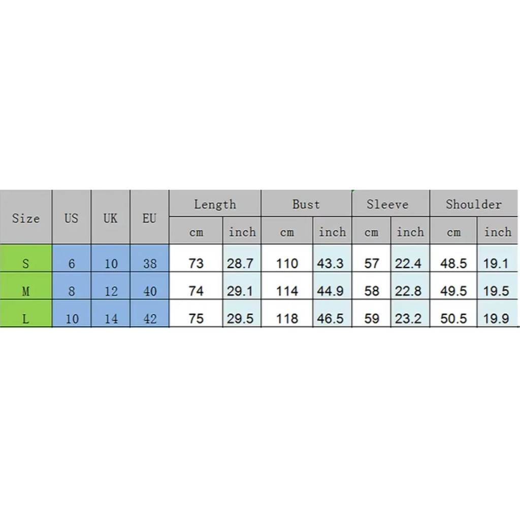 Size (US) Length (in) Bust (in) Sleeve (in) Shoulder (in)