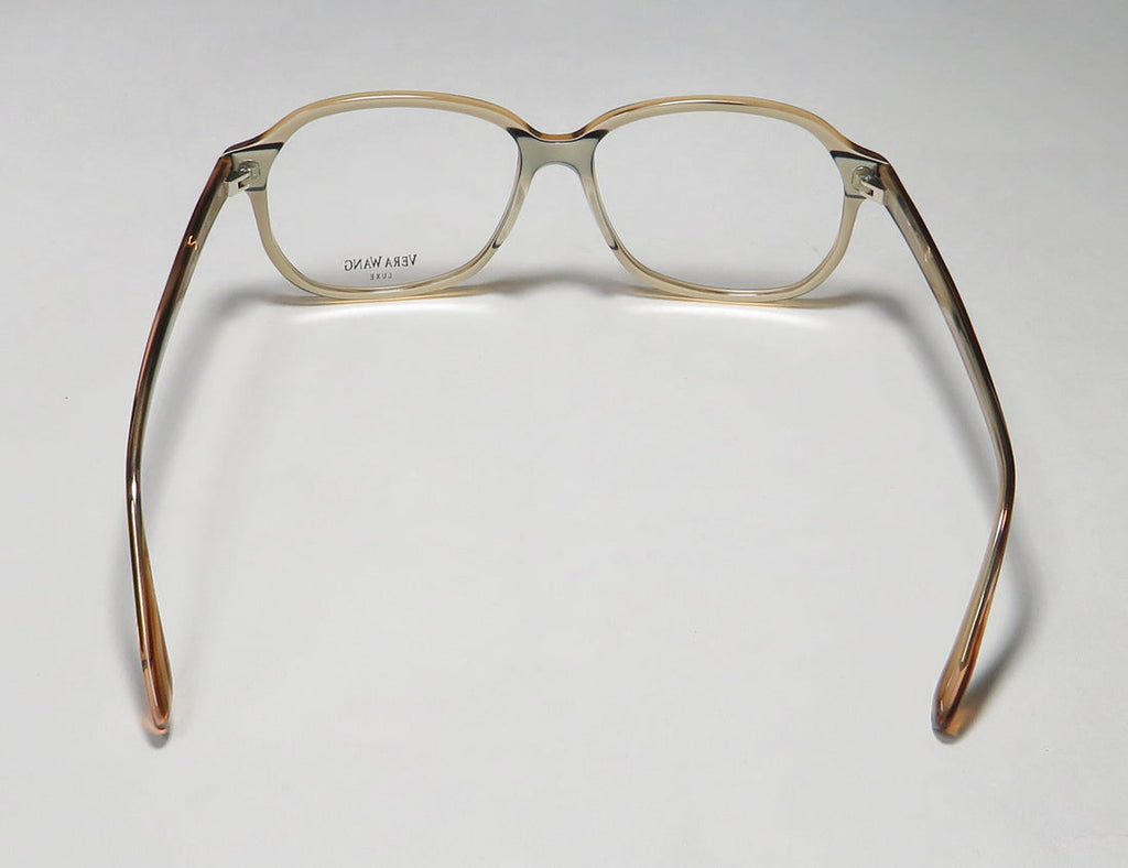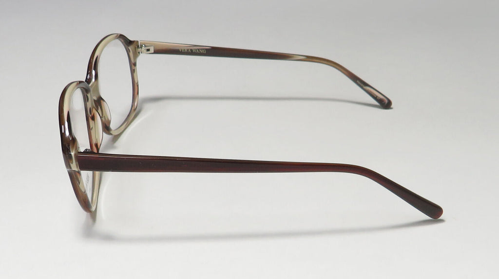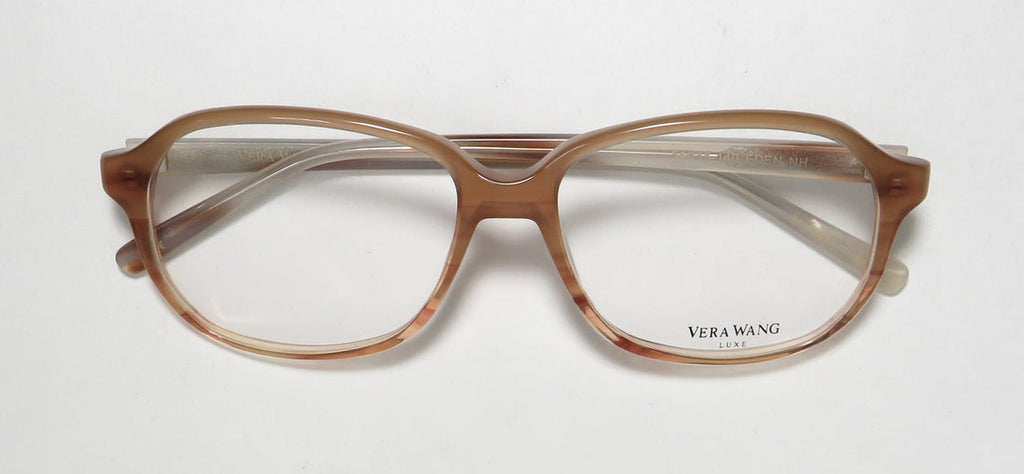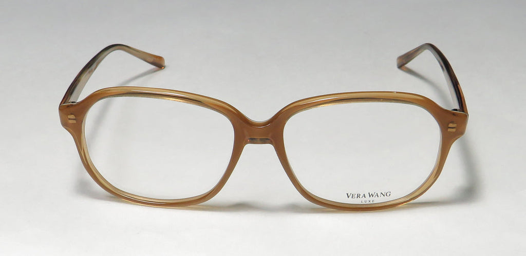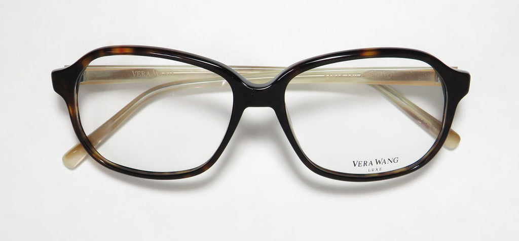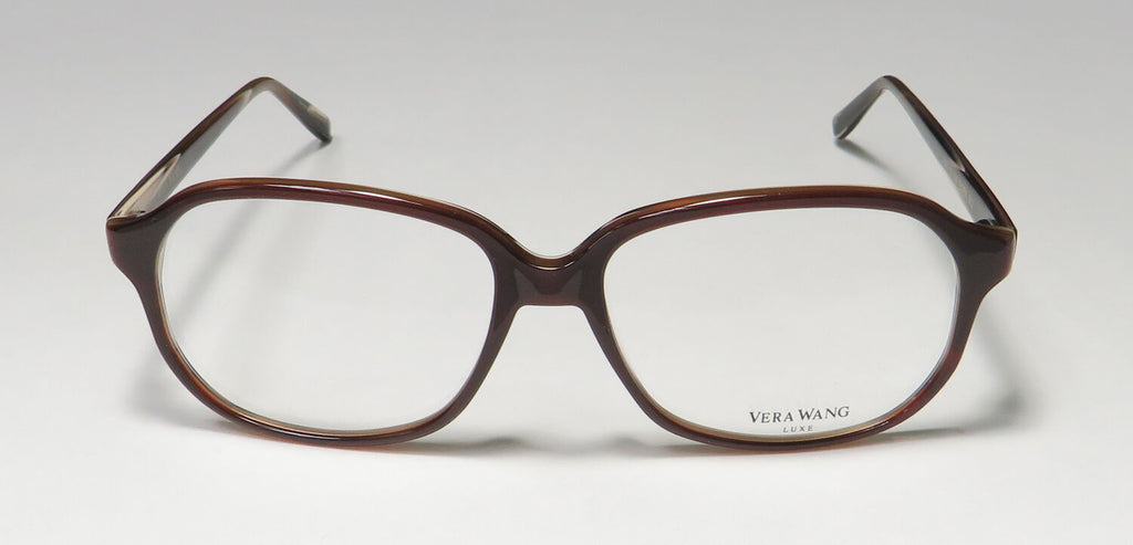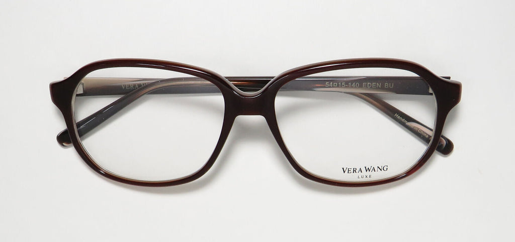 The frame is sold with demo lenses that have a logo stamped on them in ink. The frame can be fitted with real lenses at most optical stores. This frame provides comfortable fit and flatters a variety of face shapes. These eyeglasses are crafted from high quality, durable premium acetate plastic. This frame is from the exclusive Luxe collection. This is a flagship line of eyewear manufactured by Vera Wang from highest quality materials. Original case is included. The glasses are made in China.