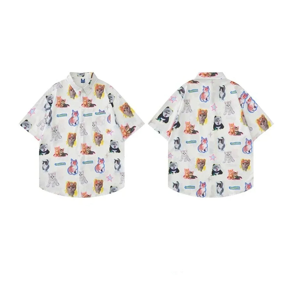 White Kawaii Cat Print Oversized Shirt – Harajuku Short Sleeve Blouse