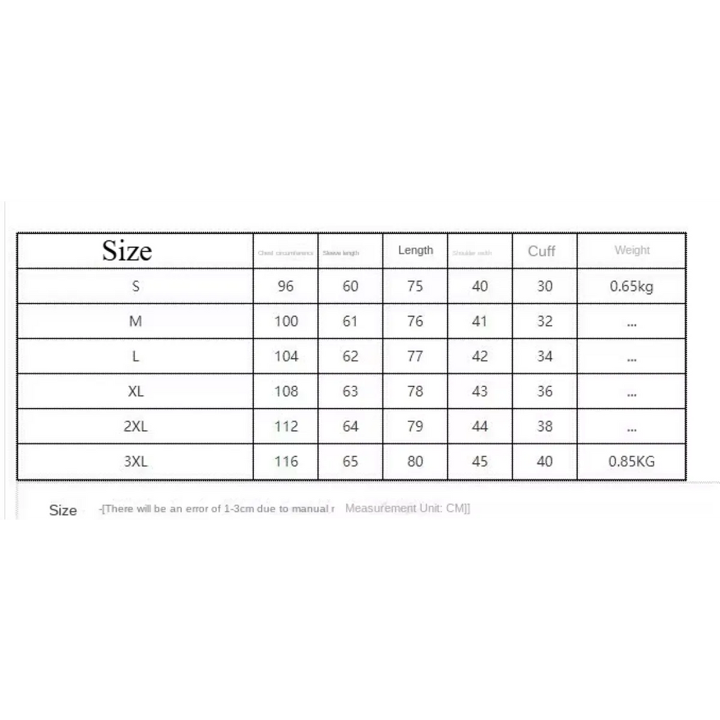Size Sleeve Length (cm/inch) Length (cm/inch)